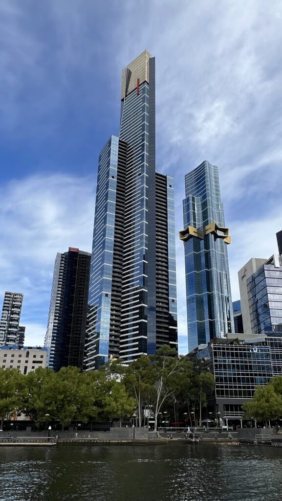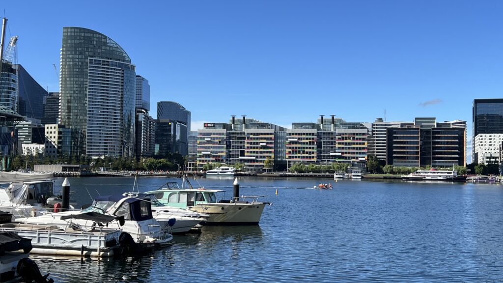 Da es aber einfach noch zu früh ist für ein Mittagessen, beschließen wir, uns mit Unterstützung der kostenlosen Tramlinien zum ehemaligen Hafenviertel, den Docklands, bringen zu lassen. Wir haben ja vor kurzem erst gesehen, wie das in Auckland ausgesehen hat… und hier? Eine herbe Enttäuschung: lächerlich wenige Yachten, dafür eine Menge hochpreisiger Luxusimmobilien und eine Uferpromenade, die steril und leblos wirkt! Das Ganze hat einfach überhaupt kein Flair, keinen Funken maritimes Leben.