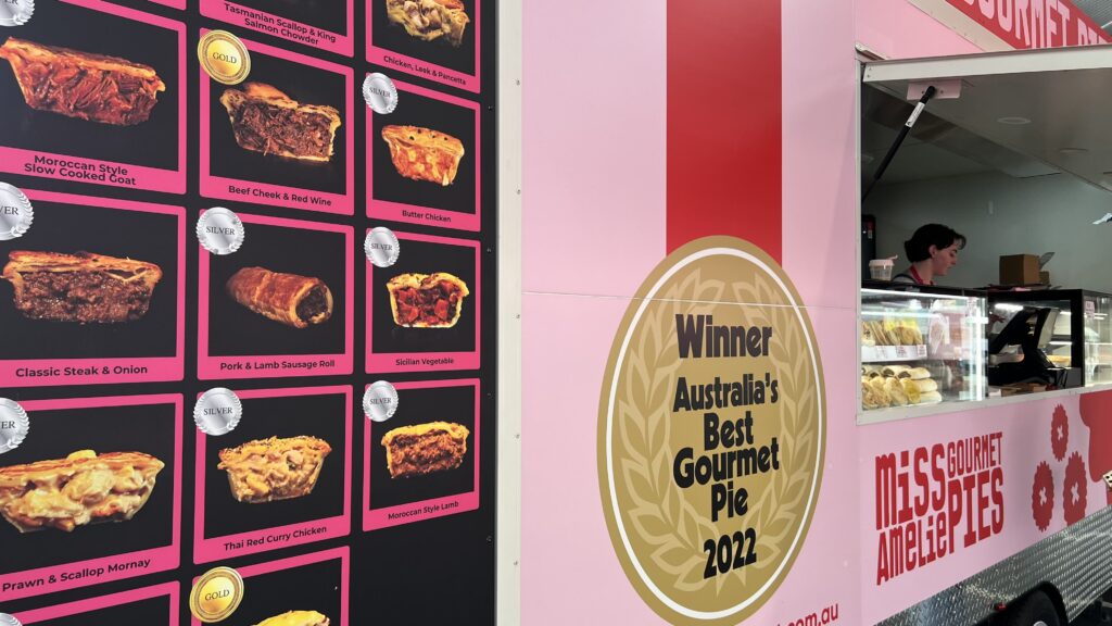Dementsprechend bald machen wir uns wieder auf den Rückweg zum Queen-Victoria-Markt. Inzwischen ist es Mittag geworden und unsere Mägen signalisieren, dass sie gerne etwas zu tun bekommen würden. Wir entscheiden uns für jeweils eine mit einer Goldmedaille bewerteten Gourmet-Pie von Miss Amelie… so sagt es zumindest die Aufschrift auf dem Verkaufsstand. Es gibt eine mit Käse-Blumenkohl-Füllung und eine mit Rinderbacke in Rotwein. Und hej, sie können es doch: Pie ohne widerliche Mehlpampe („Gravy“) in der Füllung! Nach unseren ersten Versuchen im Süden von Neuseeland hatten wir ja größtmöglichen Abstand von den Pies genommen. Und jetzt das: seeehr lecker!