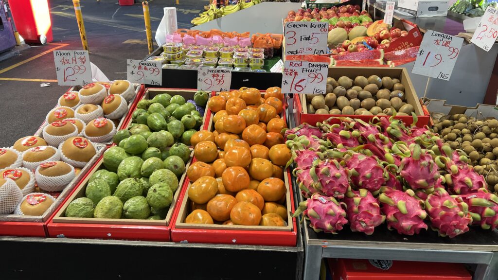 Als wir gegen halb 9 dort eintreffen, ist es noch relativ ruhig auf dem Obst- und Gemüsemarkt. Alles ist sehr appetitlich hergerichtet, die Waren sehen wunderschön aus.