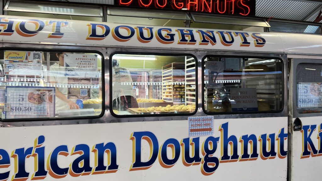 Weil wir so begeistert sind, muss die Mittagspause noch mit einem Kaffee und einer Süßigkeit gekrönt werden. Dazu haben wir uns eine Portion = 5 Stück frischer Donuts mit Marmeladenfüllung bei einem großen Verkaufswagen geholt. Dieser Stand hat nicht nur jede Menge frischer Hefeteigrohlinge auf Vorrat liegen, ständig wird Nachschub produziert. Den Laden gibt es offenbar bereits seit über 50 Jahren, er ist inzwischen eine feste Institution hier. Und er verspricht nicht zu viel, die Teilchen schmecken ausgezeichnet!!
