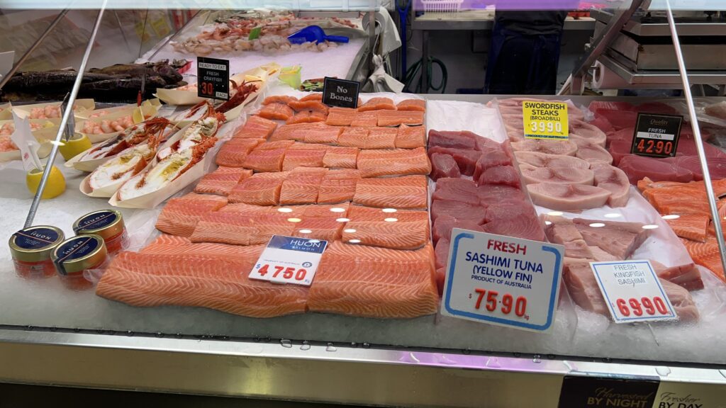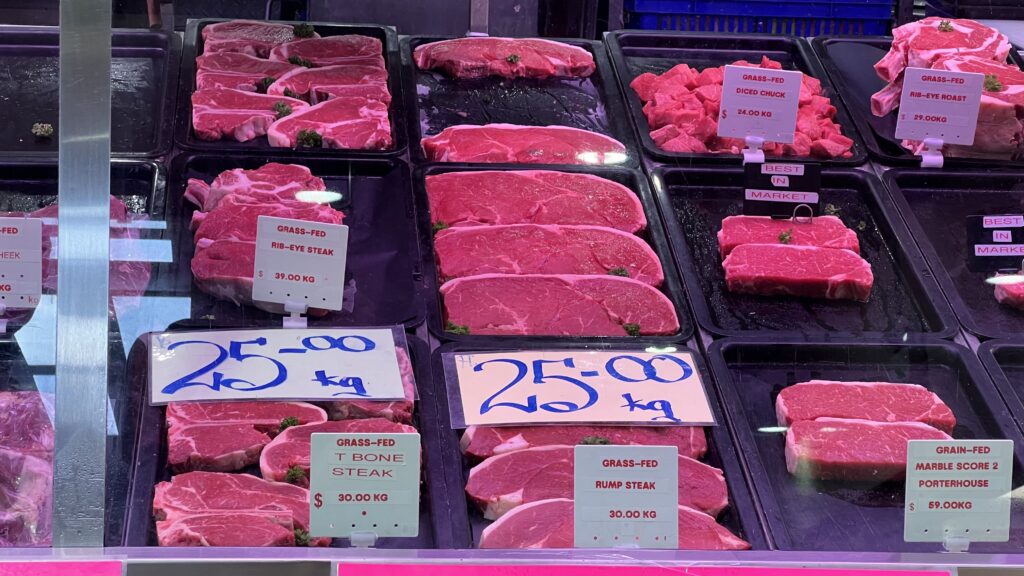 In einem benachbarten Teil werden Non-Food-Artikel wie Lederwaren, Textilien, Kunsthandwerk oder Andenken verkauft. Uns zieht es aber in eine große Halle nebenan, den Fleisch- und Fischmarkt. Die hier ausgestellten Produkte sind äußerst sauber präsentiert und von höchster Qualität.