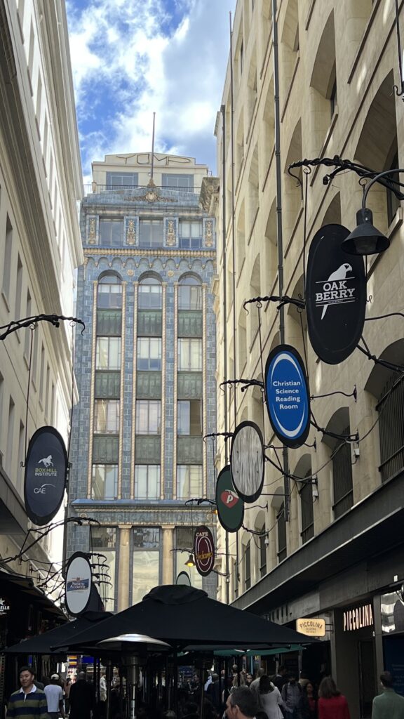 Ein weiteres architektonisches Schmuckstück entdecken wir in der Flinders Lane 258, das Ende 1929 fertiggestellte Majorca Building mit einer Fassade aus blau- und goldfarbenen Terracottakacheln.