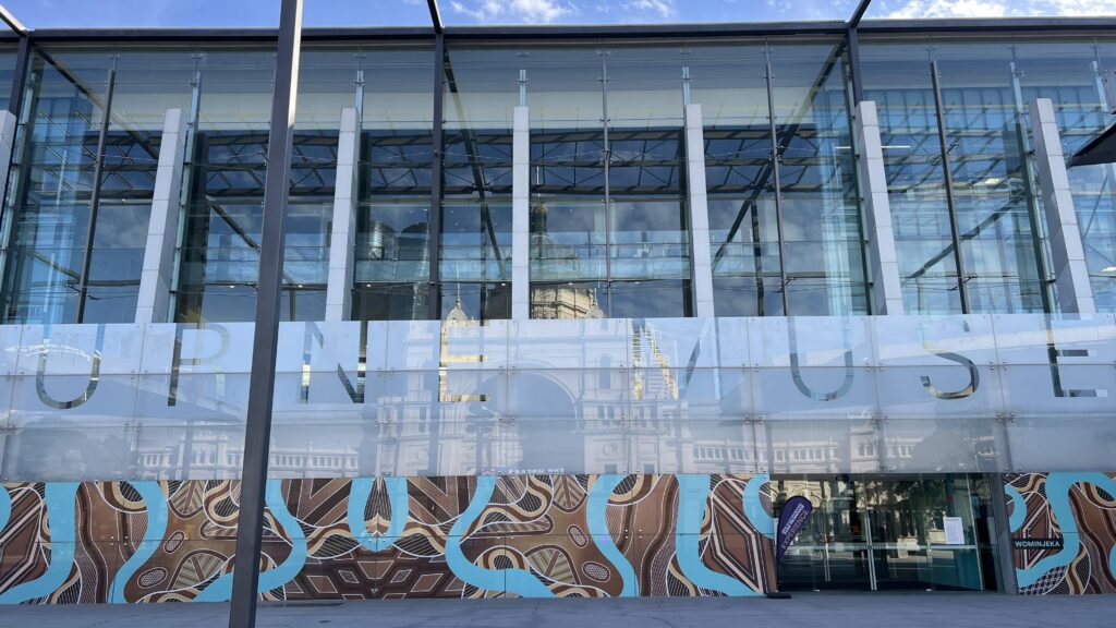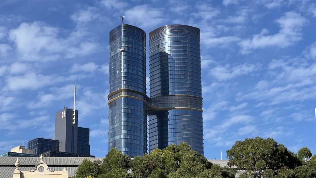 Morgens fahren wir mit der Straßenbahn bis zur Victoria Street. Eigentlich wollen wir durch die Carlton Gardens laufen, die sind aber leider komplett abgesperrt, da eine Sonderausstellung der letzten Monate gerade abgebaut wird 🙁. Also müssen wir außen herum, um zum Melbourne Museum zu kommen. Dabei fällt ein Wolkenkratzer besonders auf durch seine spezielle Architektur… irgendwie ein sehr schöner Entwurf.