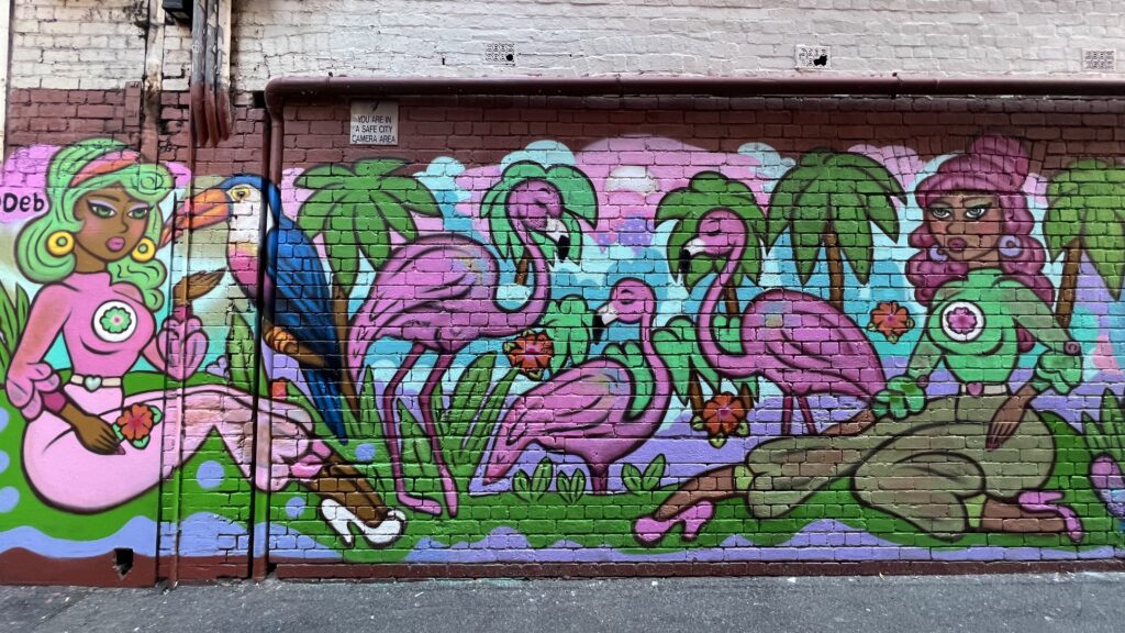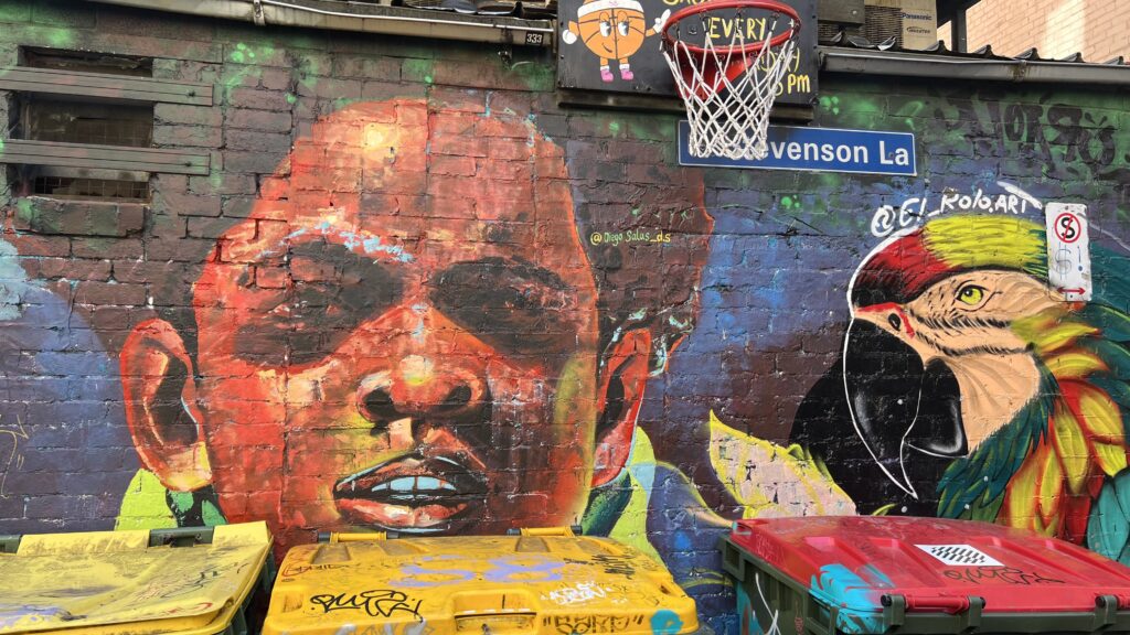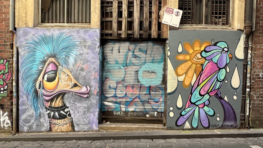 Da die Sonne heute ganz prächtig scheint, ist uns jetzt mehr nach einem Spaziergang unter freiem Himmel. Nahe der Bourke Street finden wir nochmal interessante Street Art. Diese engen Gassen sind wirklich letzte Inseln der Subkultur in einer ansonsten recht aalglatten und verspiegelten Hochglanzstadt.