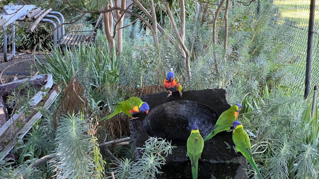 Zum Abschluss sehen wir ein paar der farbenfrohen Regenbogenloris, die sich lautstark um einen Platz an der abendlichen Badestelle streiten.