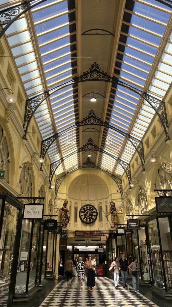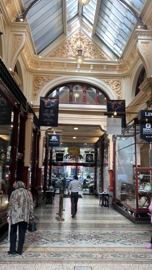 Im krassen Gegensatz dazu stehen einige der überdachten Edel-Einkaufspassagen in der Nähe, die wir danach durchstreifen. Dazu gehören etwa die Cathedral Arcade (erbaut 1926) ebenso wie die besonders prachtvollen Block (von 1892) und Royal Arcades, 1870 eröffnet.