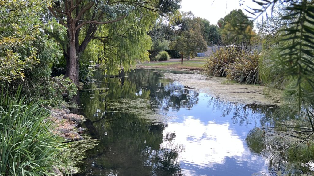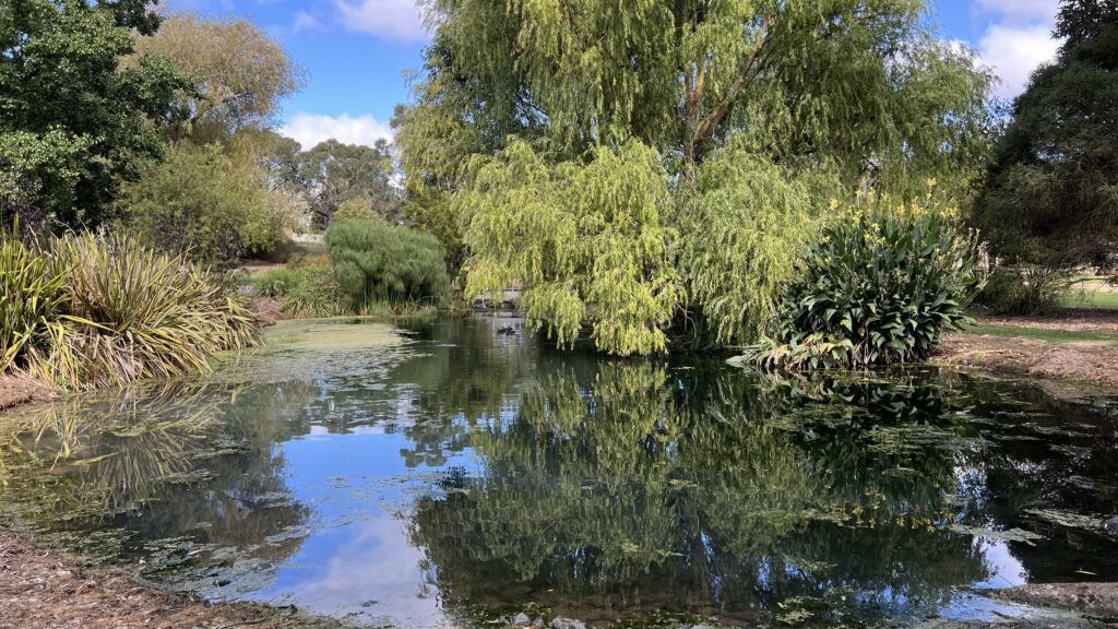 Nach einer längeren Fahrt auf schnurgerader Straße brauchen wir eine kurze Pause in Penshurst. Dort schauen wir uns den 1876 angelegten Park mit einer nicht versiegenden Quelle an. Aus einem recht großen Teich sprudelt ein kräftiger Bach hervor, in der sonst so trockenen Gegend etwas unerwartet.