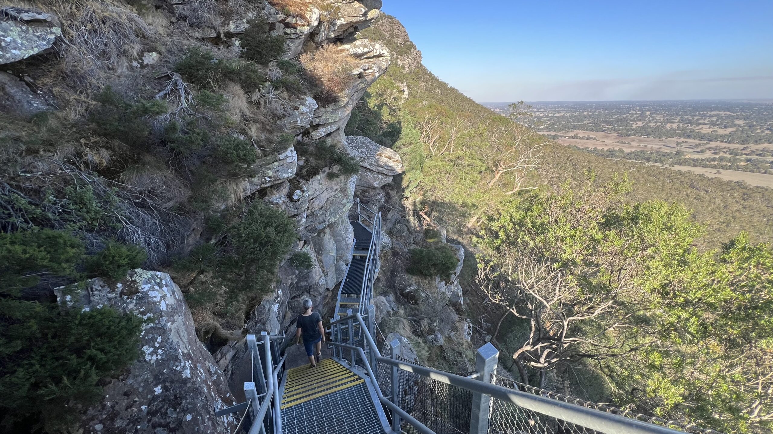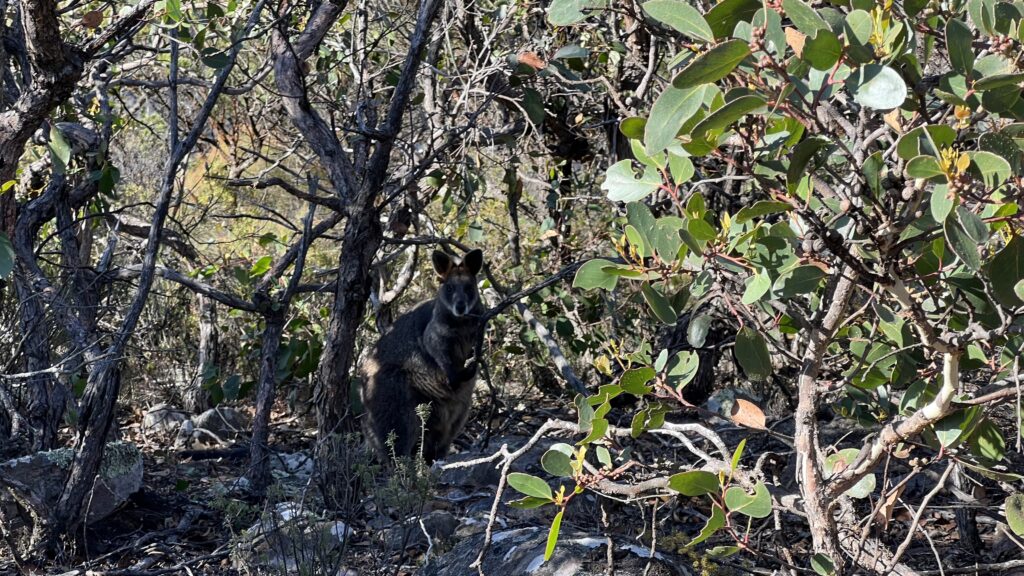 Bald darauf erreichen wir Dunkeld, einen kleinen Ort mit weniger als 700 Einwohnern am südlichen Rand des Nationalparks. Der Herr in der Touristeninfo berät uns sehr freundlich, woraufhin wir am Nachmittag die Wanderung auf den nahegelegenen Mount Sturgeon machen. Ein Rascheln im Gebüsch lässt uns aufhorchen: ein Wallaby steht seelenruhig nur wenige Meter von uns entfernt im Unterholz und schaut uns an…