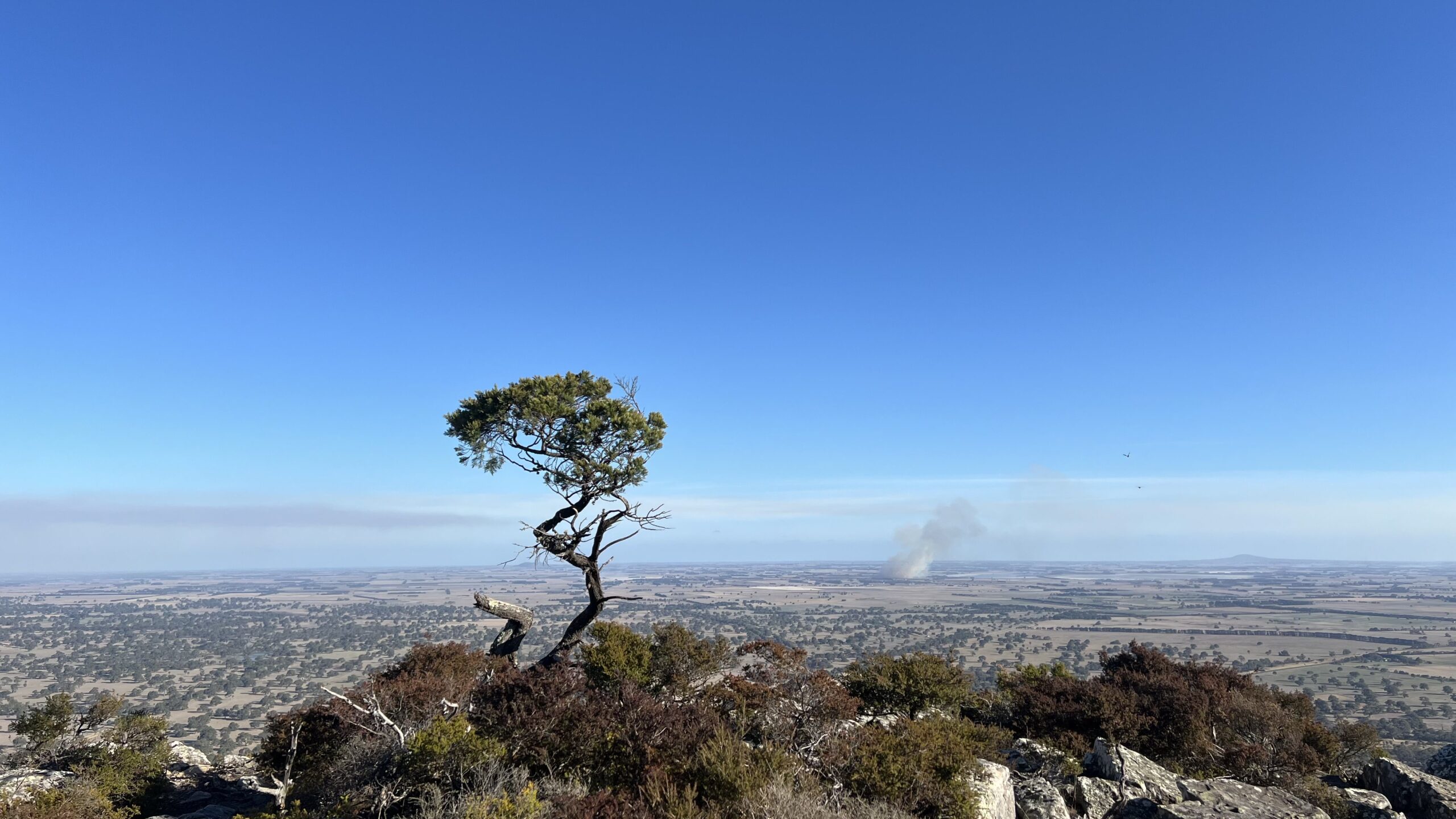 Man erkennt auch einige Buschfeuer in der Ferne, die aber wahrscheinlich zu den kontrolliert angelegten Feuern gehören. Im Gegensatz dazu haben Buschbrände natürlichen Ursprungs (ausgelöst durch Blitzeinschläge) in den letzten 3 Monaten gut 1.300 Quadratkilometer Fläche in den Grampians zerstört, d.h. fast 70% des Nationalparks! 😧 Auch einige Ortschaften wurden dabei schwer in Mitleidenschaft gezogen, Menschen und Tiere sind zu Tode gekommen, Häuser und landwirtschaftliche Einrichtungen wurden zerstört…