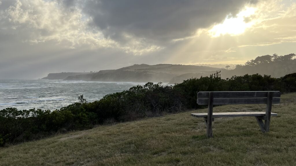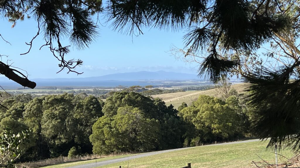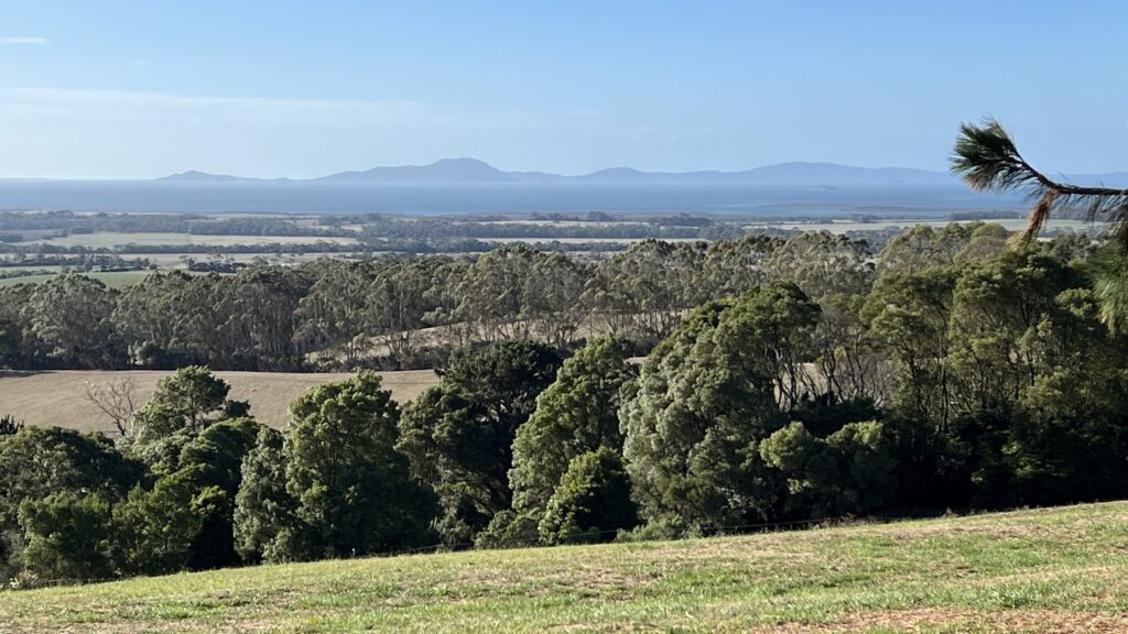 Bei strahlendem Sonnenschein und satten 9 Grad starten wir in diesen Morgen. Die ersten paar Kilometer führen über eine kleine Hügelkette, von der man einen sensationellen Blick nach Südost auf den Wilsons Promontory hat. Allerdings weht ein heftiger und darüberhinaus eisig kalter Wind, der einen fast von den Füßen reißt!