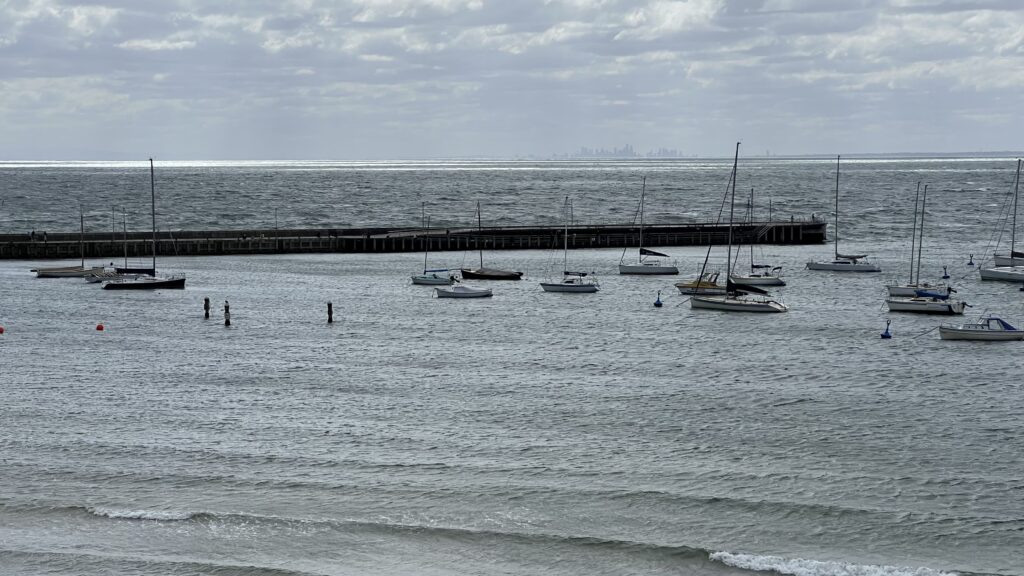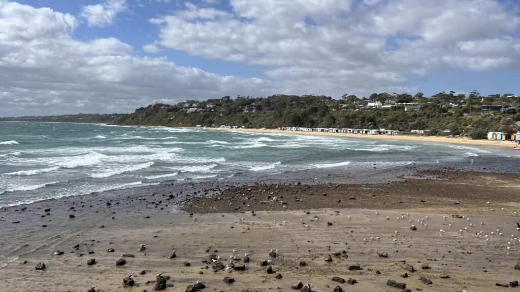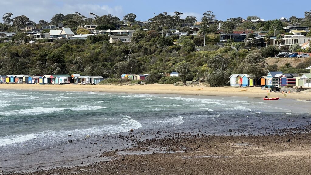 Vorbei an Wonthaggi und Lang Lang (nein, nicht der mit dem Klavier 😉) umrunden wir die große Bucht, den Western Port, bis wir nach Mornington kommen. An der Hafenmole schlagen die Wellen teilweise über die Kaimauer, kein einziges Segelboot ist draußen, der Wind ist einfach zu stark. Die kleine Stadt macht einen ganz netten Eindruck, besonders gut gefallen uns die kleinen bunten Badehäuschen am Strand.