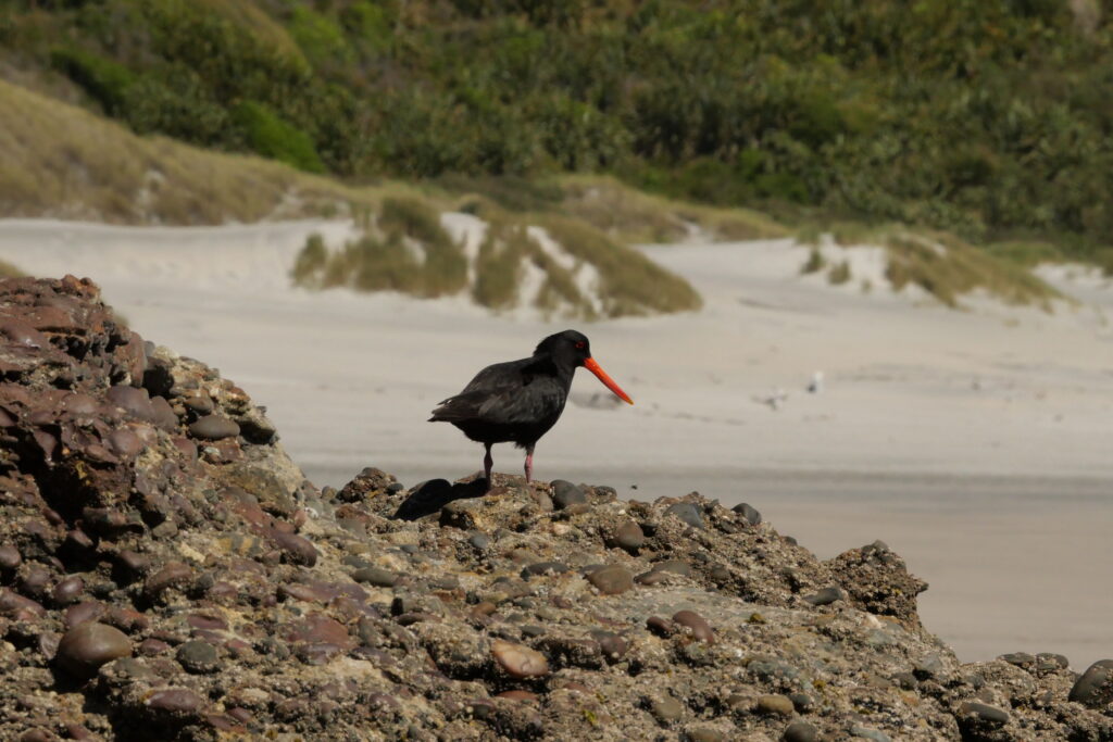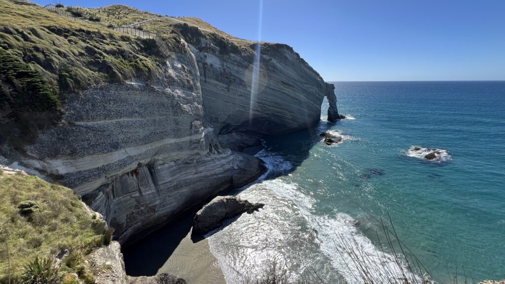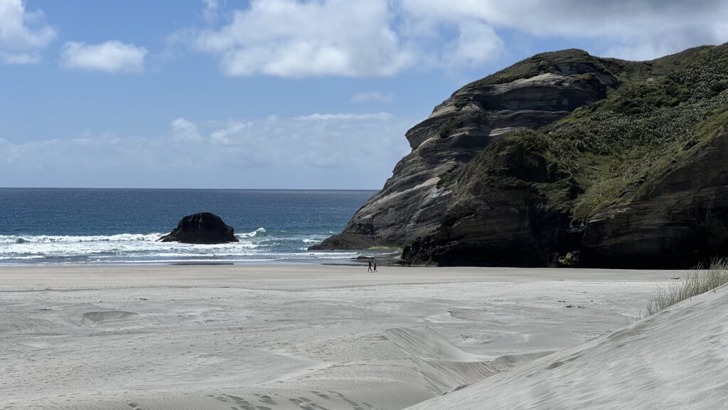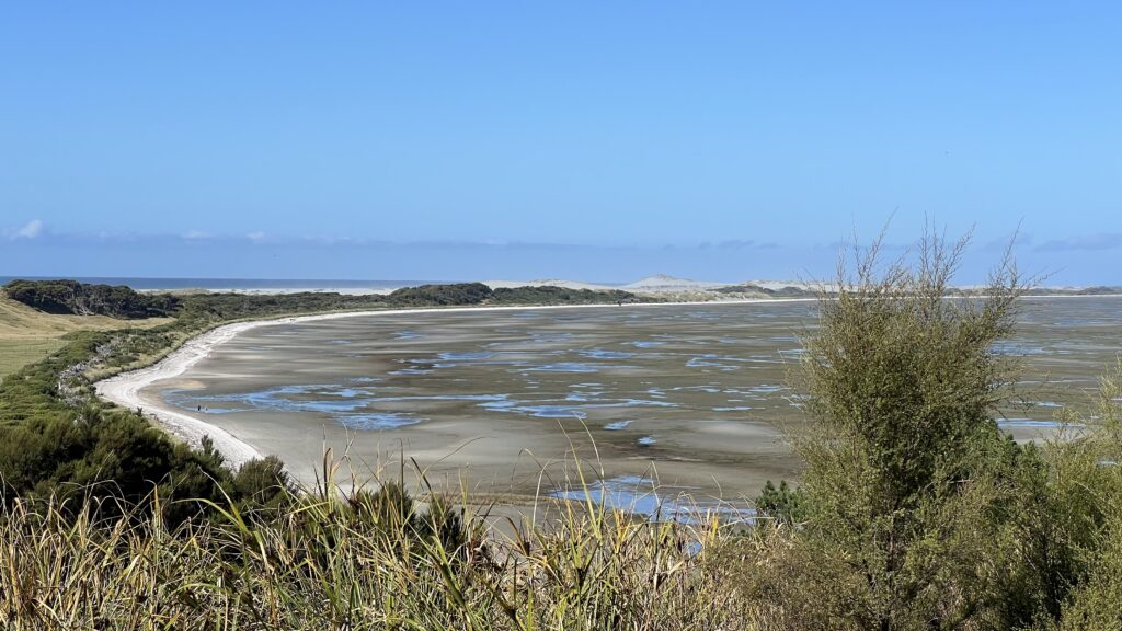An das Kliff anschließend zieht sich eine ca. 35km lange flache Landzunge im großen Bogen nach Osten, der Farewell Spit. Er ist entstanden durch die starken Meeresströmungen an dieser Küste und wächst wohl allmählich immer weiter.