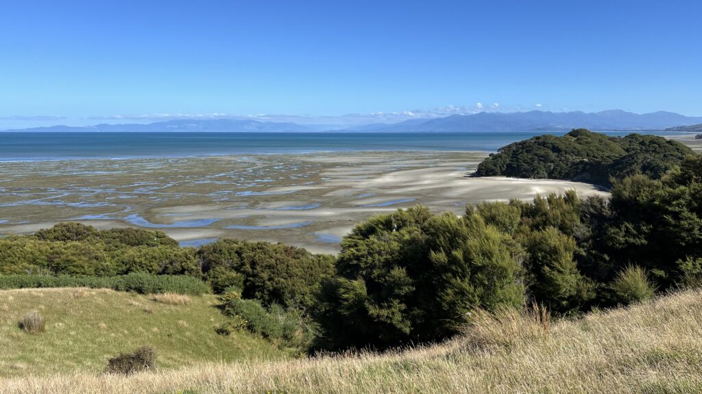Die Straße führt in einem großen Bogen immer entlang der Golden Bay, einer riesigen extrem flachen Meeresbucht. Große Teile liegen bei Ebbe nahezu trocken, von weitem sieht man gelegentlich Seevögel herumlaufen.