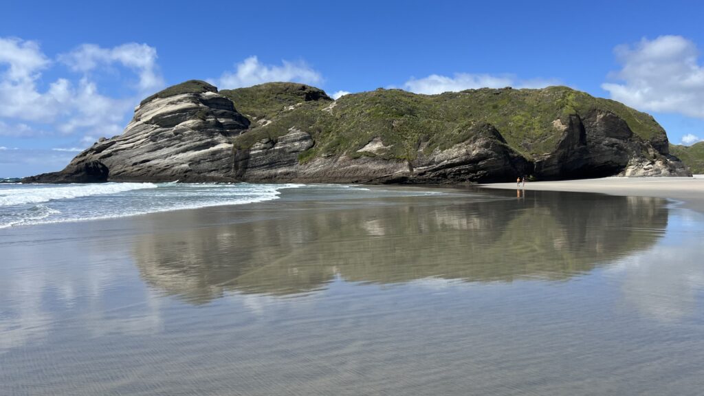 Nach dem letzten Stück Schotterpiste laufen wir los, quer durch Farmgelände, auf dem Schafe weiden. Dann liegt plötzlich der breite Wharariki Beach vor uns mit seinen markanten Felsen im türkisfarbenem Meer – wow! Nebenbei: von hier stammt auch der Bildschirmhintergrund von Windows, der mit dem Torfelsen im flachen Wasser…