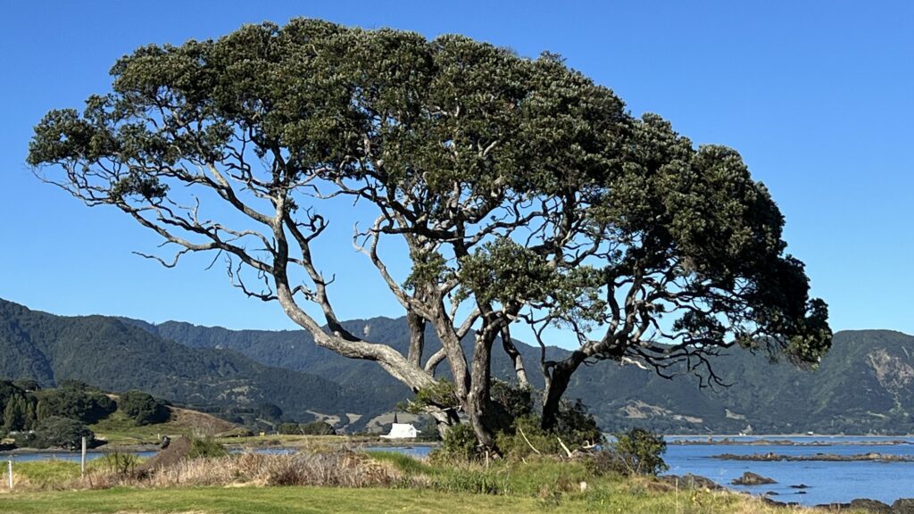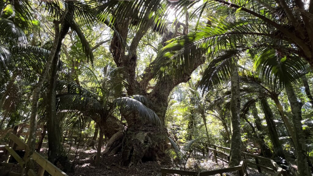 Kurz hinter Opotiki biegen wir ab, um einen besonderen Baumveteranen zu sehen. Die geschätzt 2.000(!) Jahre alte Pflanze, ein Puriribaum, wurde vor etwa 100 Jahren entdeckt und unter Schutz gestellt. Man fand heraus, dass für die Maori dieser Baum heilig ist und eine sehr spezielle Bedeutung hat. Die Hohlräume des Stammes dienten zur Bestattung der knöchernen Überreste Verstorbener. Ein lokales Gremium sorgte dafür, dass das Gelände um den Bestattungsbaum aufgekauft und mit einem ganzen Wald verschiedener endemischer Pflanzen ausgestattet und öffentlich zugänglich gemacht wurde, die Hukutaia Domain. In jedem Fall sehen wir einen vielgestaltigen Stamm mit reich verzweigten Ästen mitten in einem dichten, urwaldartigen Bewuchs, schattig und mit vielen Vogelstimmen, eine sehr mystische Atmosphäre – wie in einem Zeitsprung.