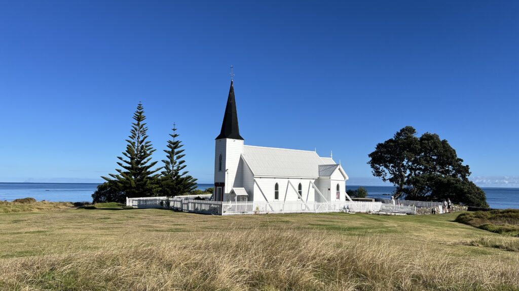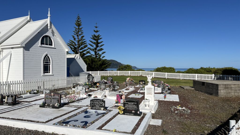 Die schneeweiße Raukokore Anglican Church von 1894 steht einsam und allein am Ufer, sehr pittoresk! Am felsigen Strand liegen eine Menge großer Schneckenhäuser herum, kleine Abalonemuscheln und verschiedene Algen.