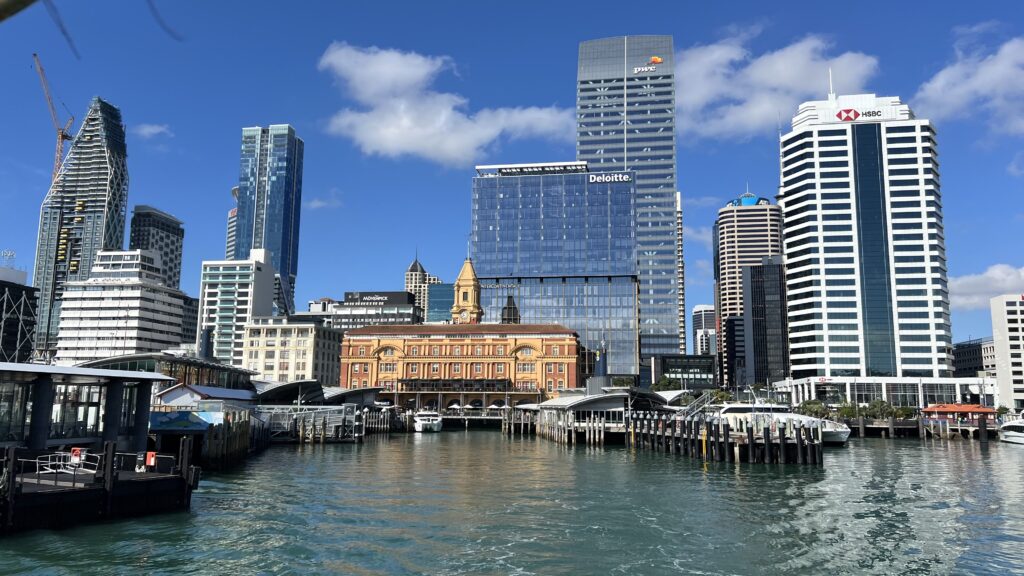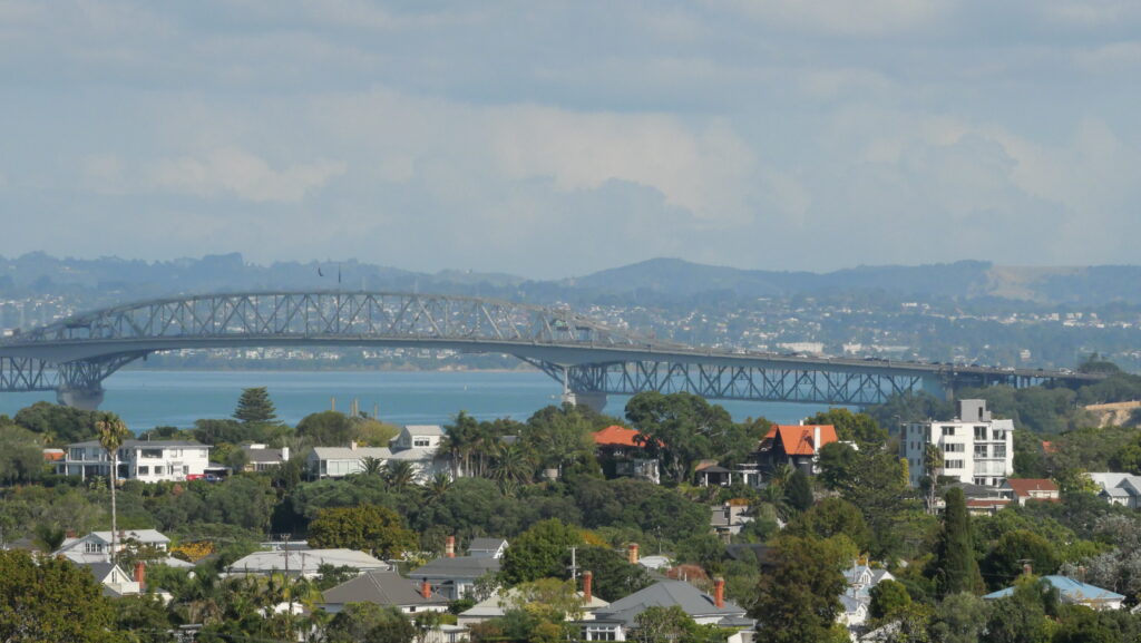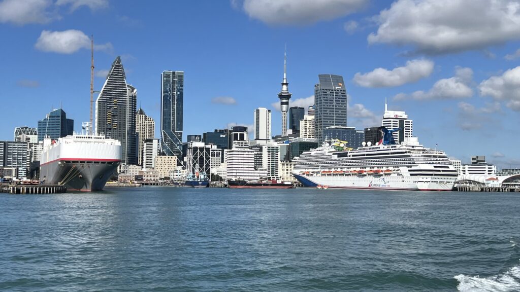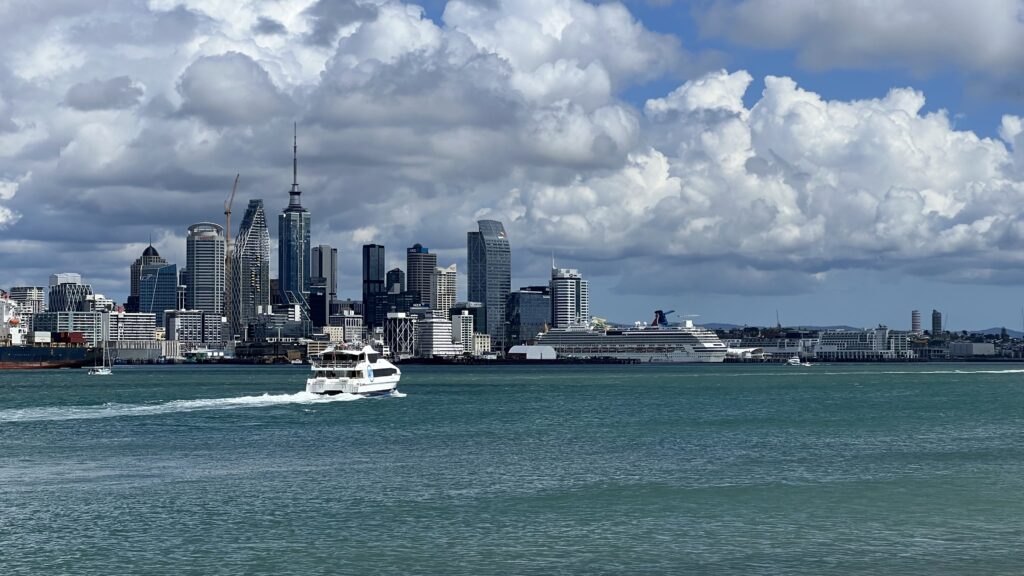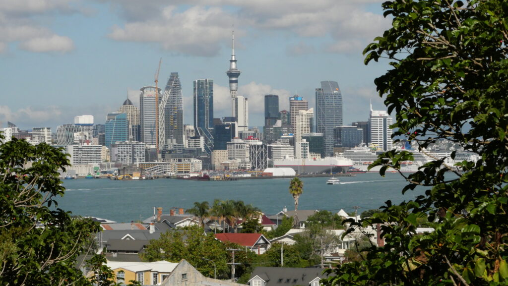 Auf der anderen Seite liegt das Stadtzentrum von Auckland mit all den Wolkenkratzern, ein Kreuzfahrtschiff liegt davor. Seitlich ist der Industriehafen mit der Stückgutabfertigung und einem größeren Autofrachter. Zur anderen Seite der City befindet sich der Freizeithafen mit schier unendlich vielen schneeweißen Booten und natürlich die Harbour Bridge.