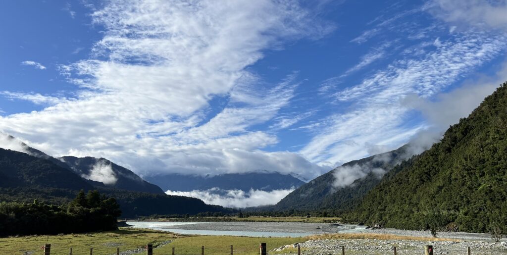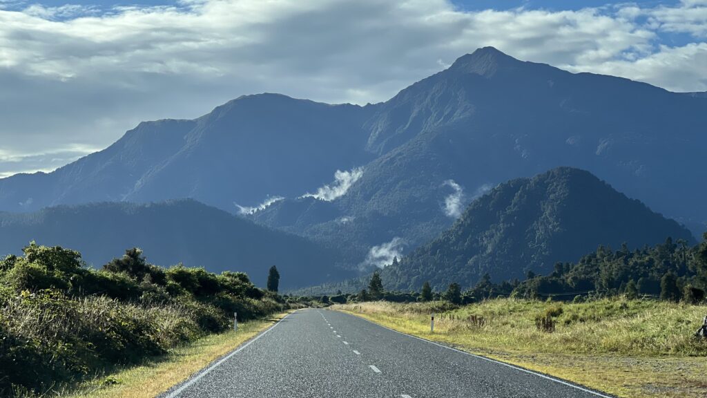 Nachdem es über Nacht nochmal ordentlich geregnet hat, scheint heute bereits recht früh die Sonne durch die restlichen Wolken. Das bessere Wetter ist quasi hörbar für uns, denn vom nahen Heliport starten die Sightseeingflüge im Zehnminutentakt. Wir reisen heute wieder weiter gen Norden, unser Tagesziel ist Punakaiki.