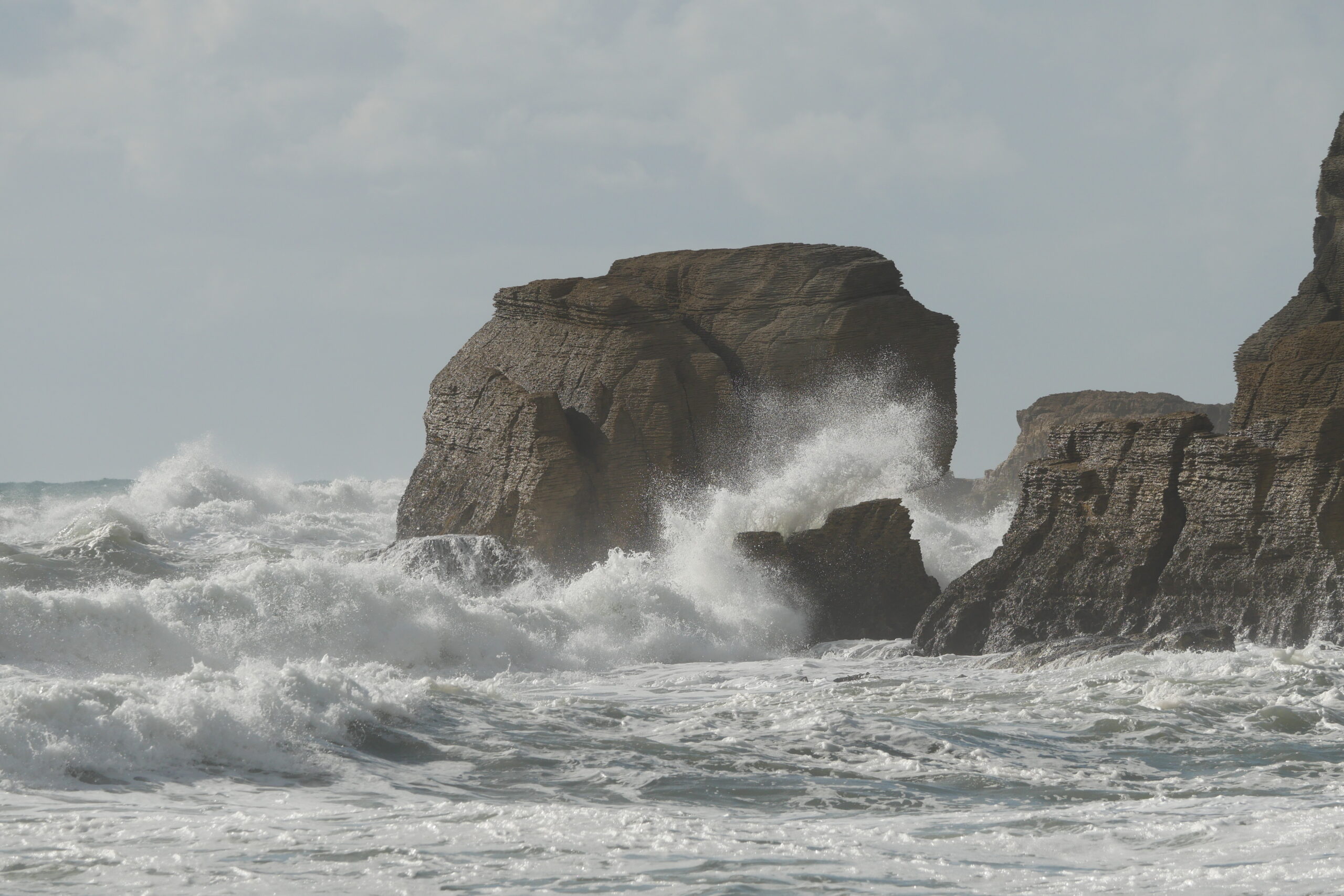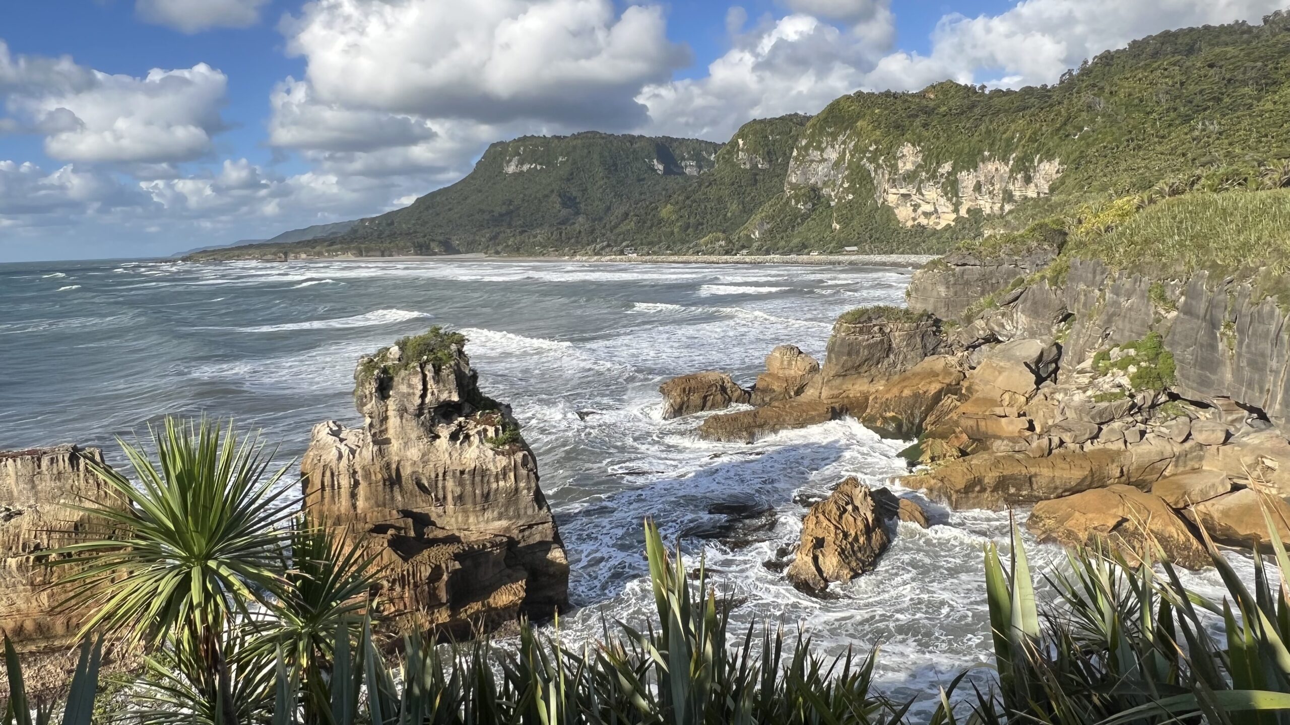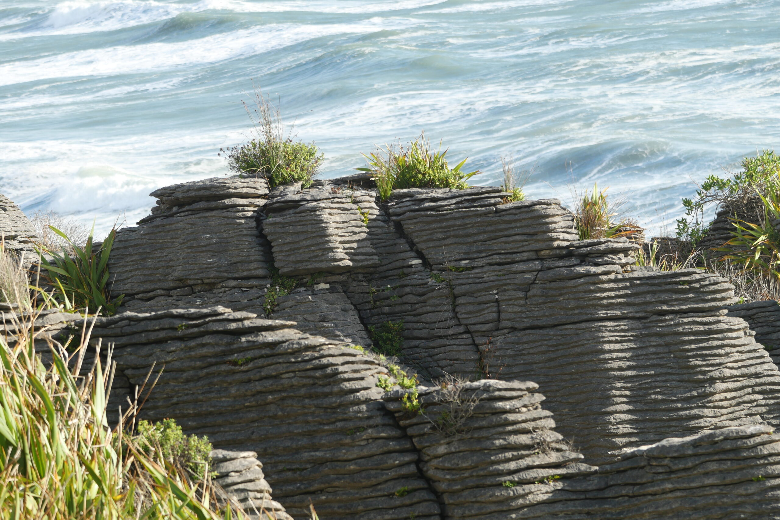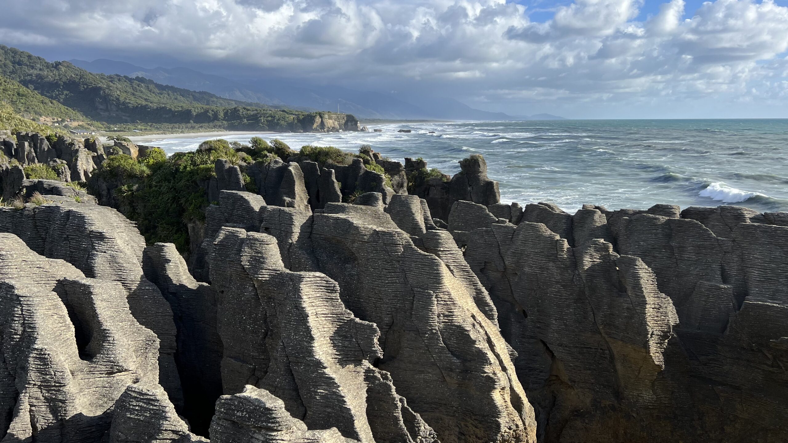 Unser neues Quartier liegt fast direkt am Meer, wo bizarre Kalksteinformationen (Pancake Rocks) von einer lebhaften Brandung umtost werden und wir Austernfischer am Strand sehen.