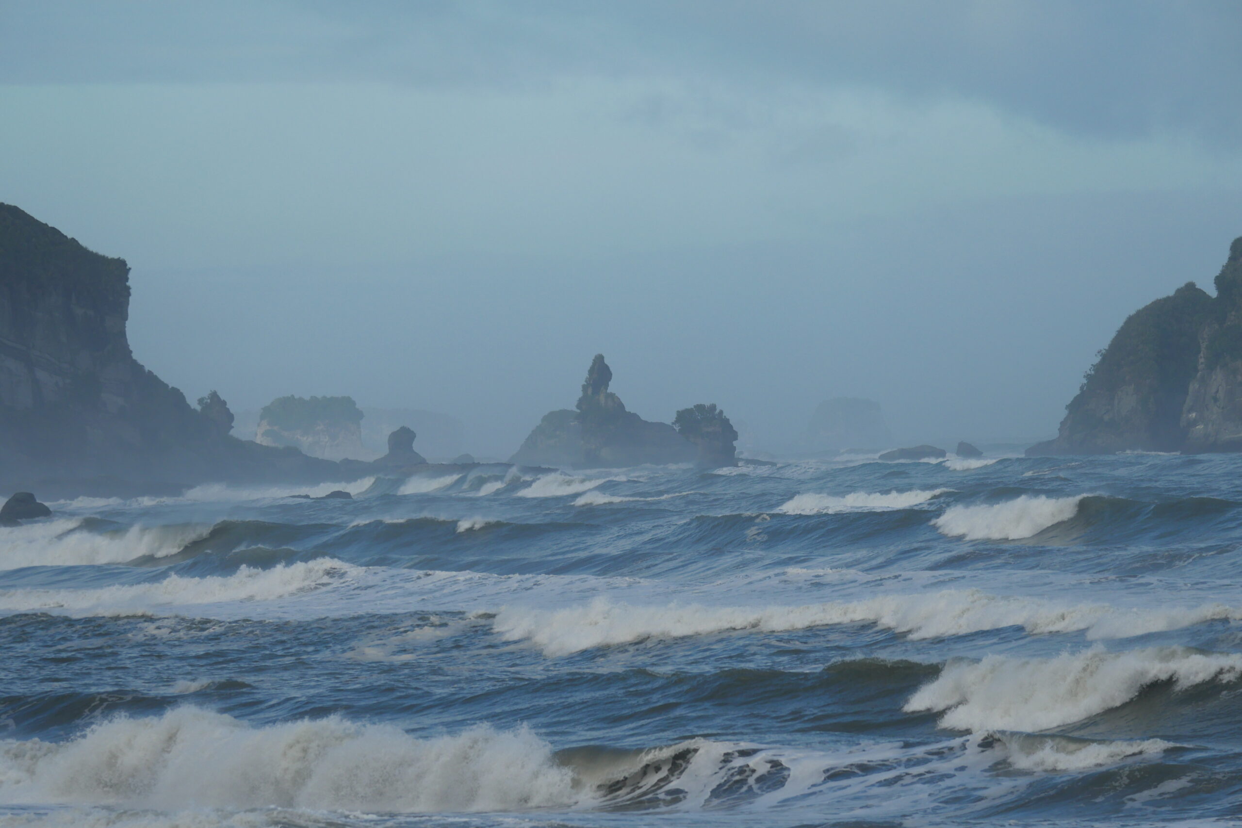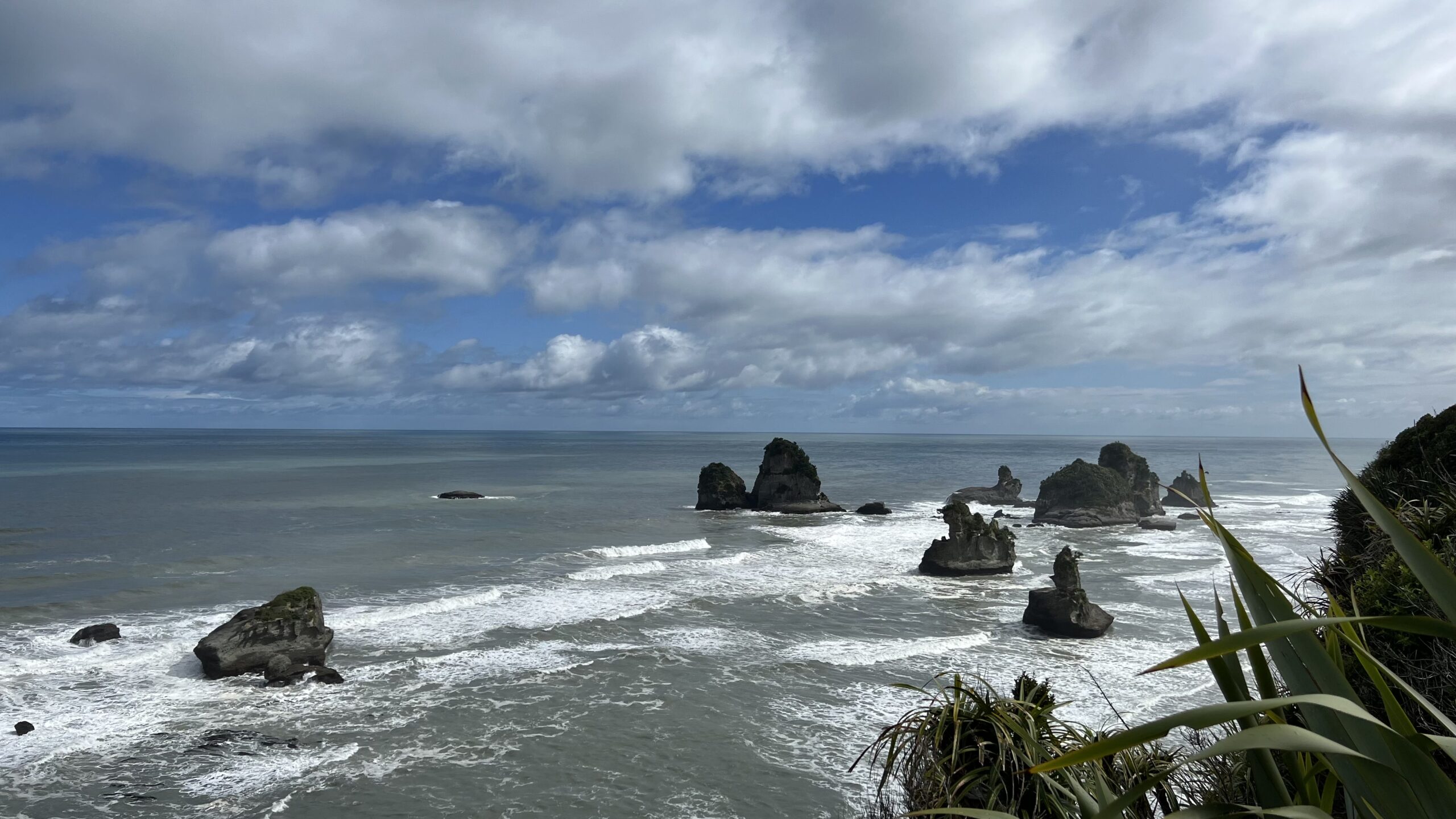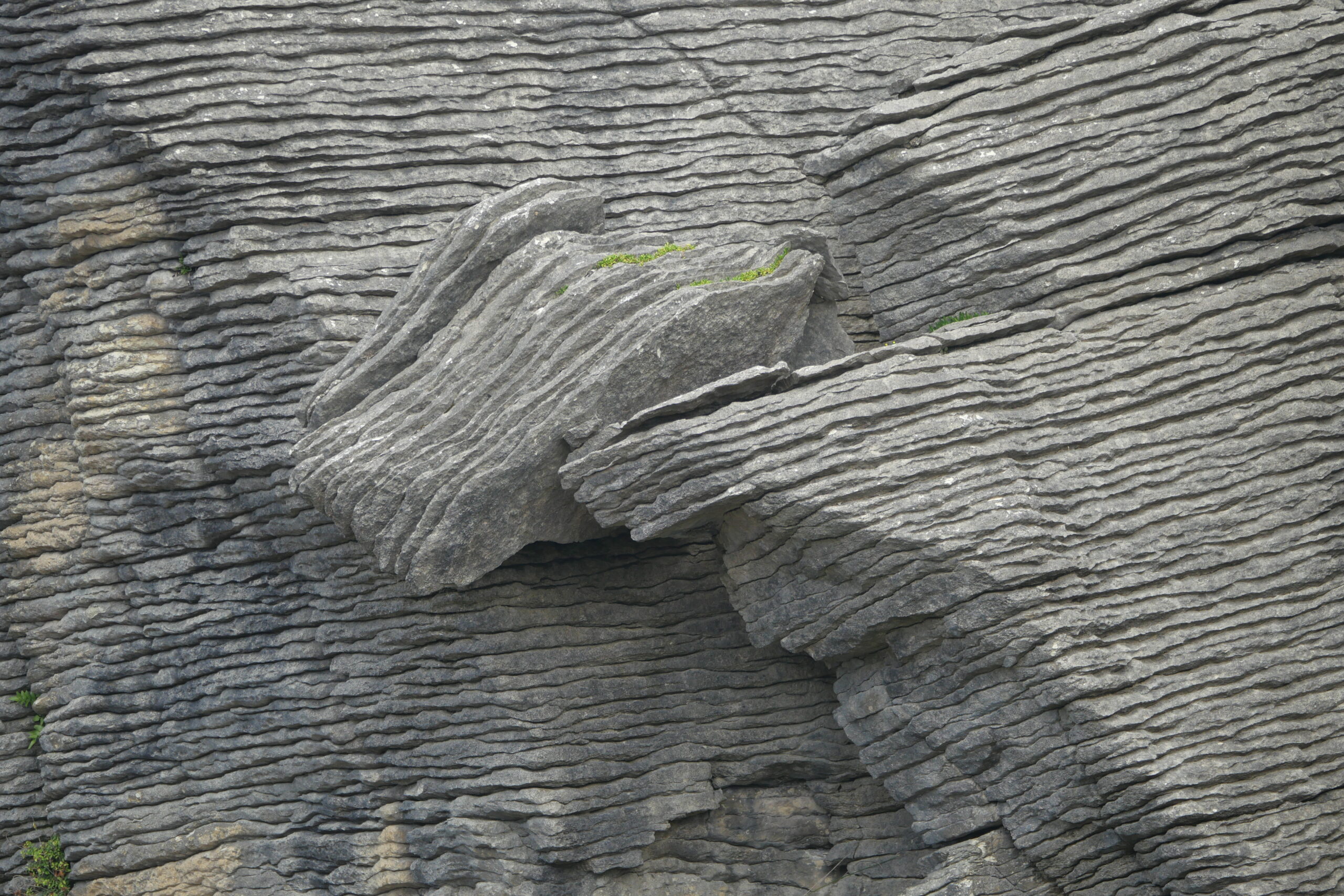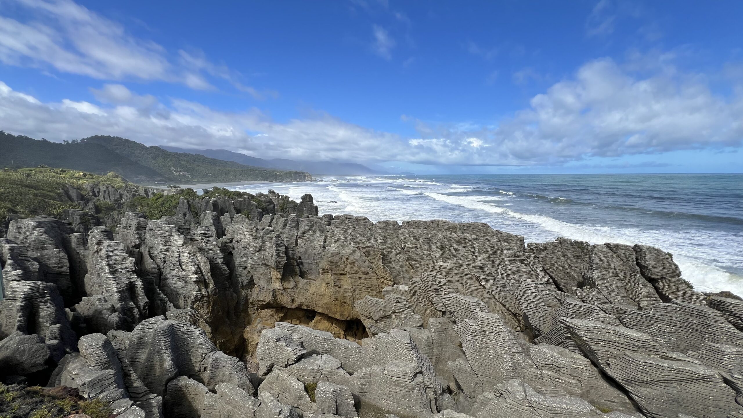 Der Nationalpark, in dem wir uns gerade befinden, erstreckt sich vom Paparoa-Höhenzug aus rund 1.400m bis hinunter zum Meer. Charakteristisch sind vor allem die durch den Untergrund aus Kalkstein bedingten Felsformationen und Karsthöhlen. Ein besonders schönes Beispiel findet sich am Dolomite Point, wo Schichten tonhaltigeren Bodens sich mit festeren Kalkschichten abwechseln und unterschiedlich schnell verwittern. Die dadurch hervorgerufenen Querstreifen erinnern an geschichtete Pfannkuchen – daher der Name „Pancake Rocks“.