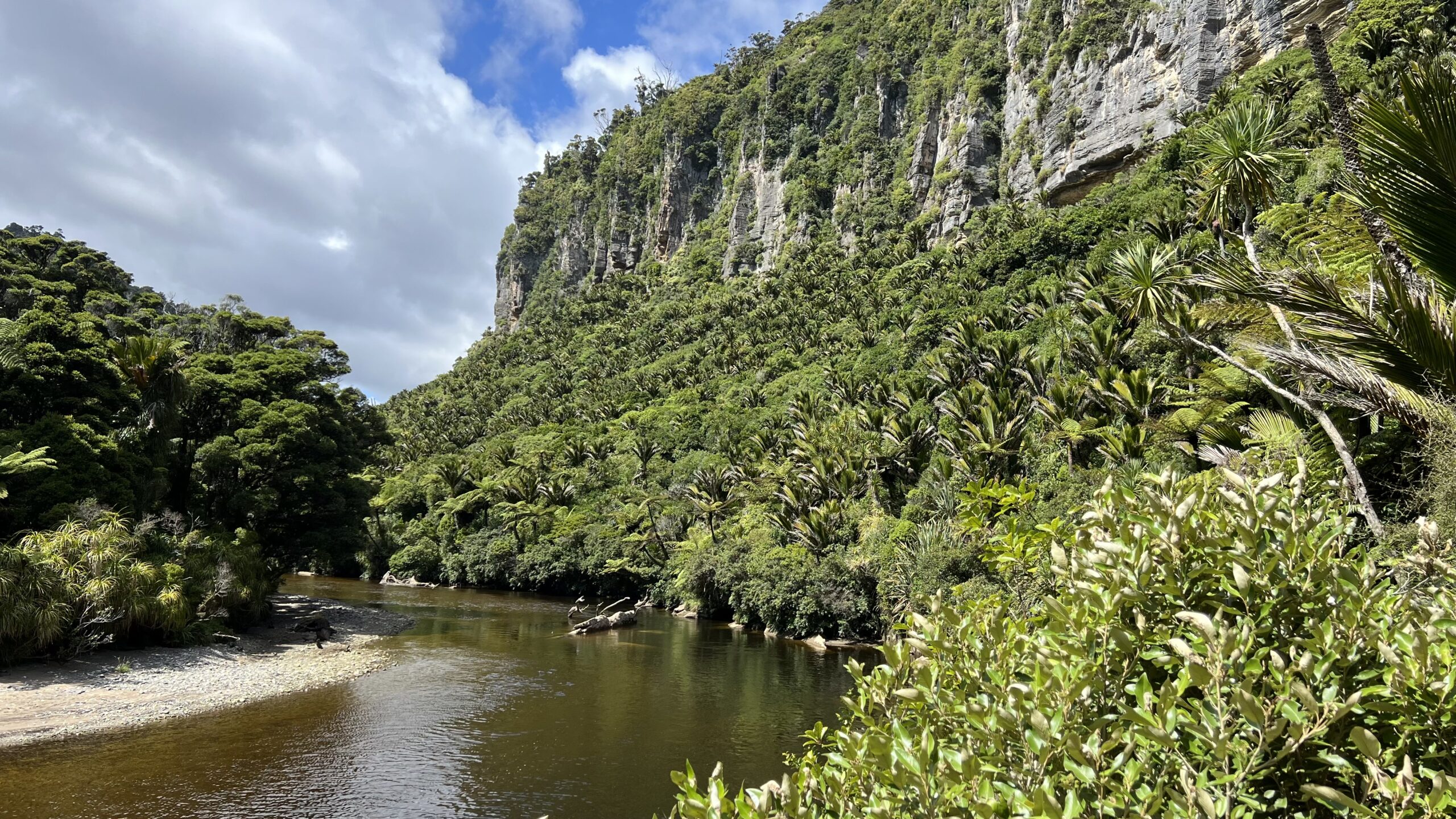 An denen können wir auch heute einfach nicht vorbeigehen, sie liegen ja auch quasi auf der Wanderroute. Der Track ist markiert als Punakaiki-Pororari River-Trail, führt zunächst durch die tiefe Schlucht des Pororari, dann über einen Landrücken ins Nachbartal und wieder zurück.