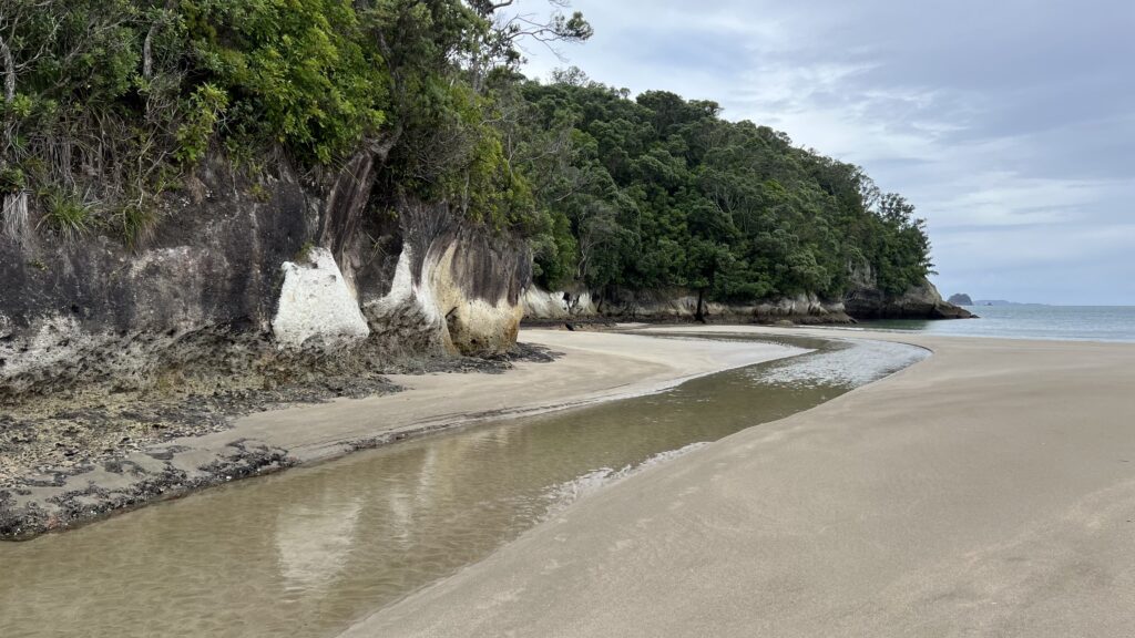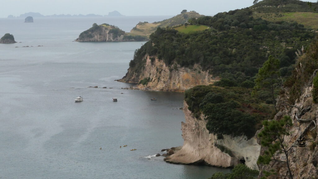 An diesem Morgen ist ein bisschen Beeilung geboten, denn a) soll es ab Mittag Regen geben und b) wollen wir möglichst noch deutlich vor dem Höhepunkt der Flut um 11:02 Uhr an einem bestimmten Punkt gewesen sein… also los! Nun ja, nach leichten Verwirrungen ob der Parkmöglichkeiten in Hahei stiefeln wir um 9:05 Uhr endlich los. Wir nehmen eine bös stufenlastige Abkürzung durch ein Wohngebiet und schaffen es tatsächlich bis 9:55 Uhr (inklusive einiger Fotostopps) rauf-rüber-runter zur Mare’s Leg Cove.