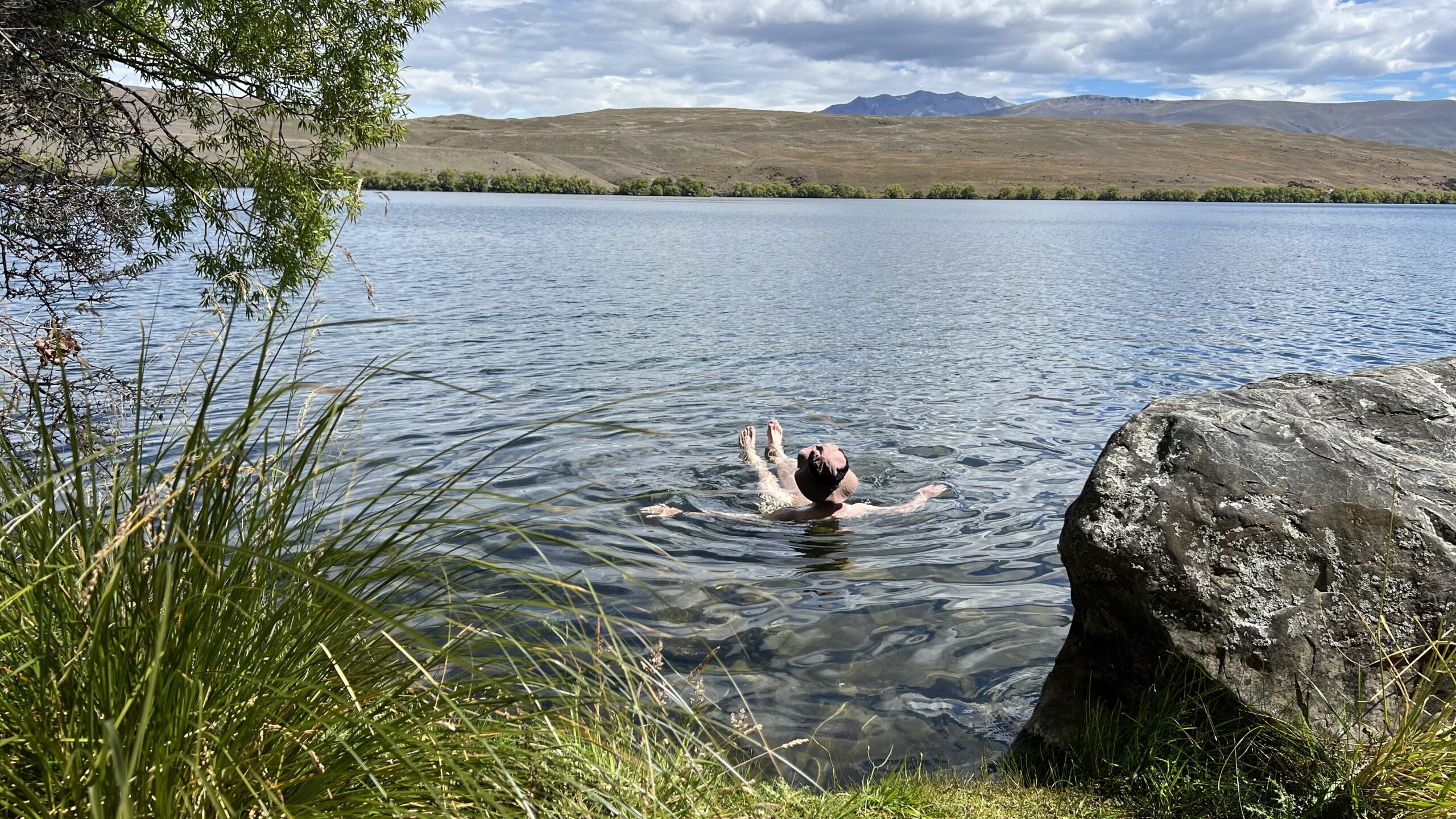 So gestärkt geht es weiter zum nahe gelegenen Lake Alexandrina, dort soll es einen einfachen Weg entlang des Ufers geben, hatte man uns gesagt. Wir stellen das Auto am Ende einer (gut befahrbaren) Schotterpiste ab, die zu einem kleinen Campingplatz führt. Einen richtigen Parkplatz gibt es hier nicht, wir sind offenbar die einzigen Nicht-Anwohner hier. Den Einstieg zur Wanderung müssen wir etwas suchen, sind dann aber schnell auf dem richtigen Pfad. Der See ist sehr ruhig, kein Wassersport, überhaupt kaum eine Menschenseele, das strahlendblaue Wasser plätschert leise, ab und zu sehen wir einige Wasservögel (Schwarzschwäne, Haubentaucher, Paradiesgänse u.a.). Wir laufen bis zu einem anderen, ebenfalls sehr einfachen Campground, der ähnlich idyllisch und verschlafen wirkt. Einer von uns beiden ist nicht mehr zu halten und muss unbedingt kurz baden gehen – sehr erfrischend!