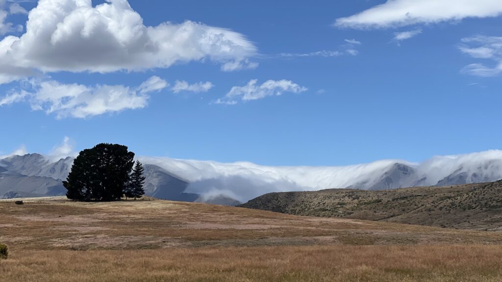 Auf dem Rückweg zu unserer Unterkunft staunen wir nochmal über die herrliche Landschaft: in einiger Entfernung „fließt“ eine dick-wattige Wolkendecke über einen Bergkamm.