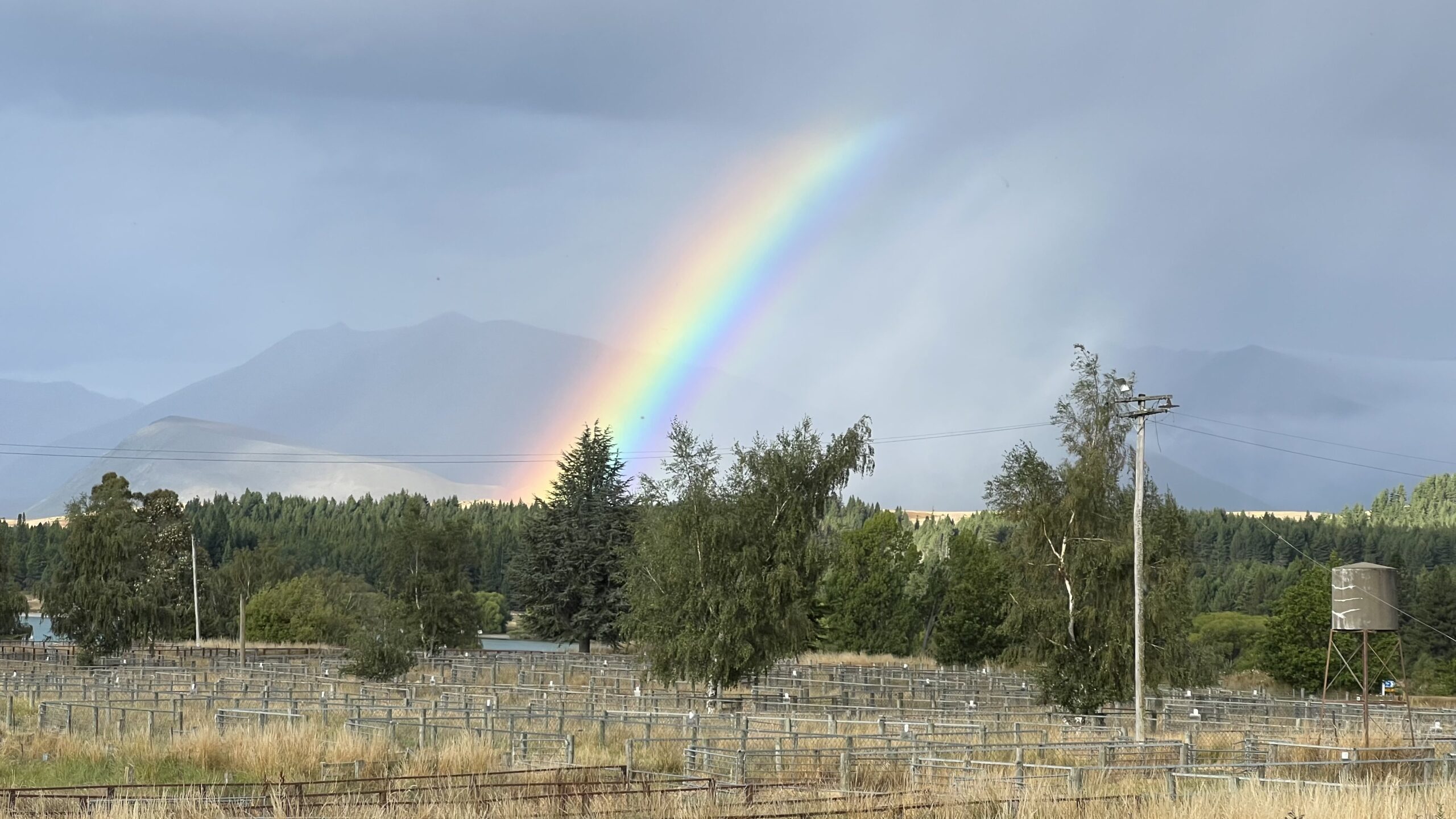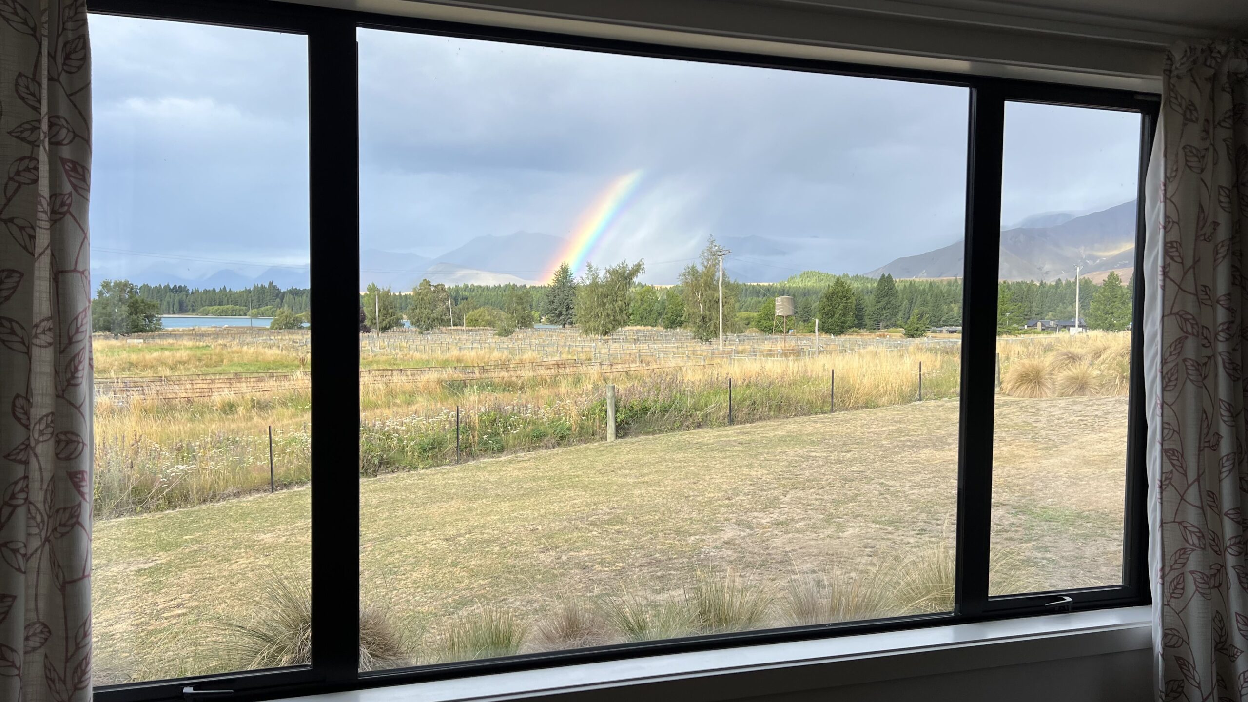 Unser selbstgemachtes Abendessen bekommen wir heute wieder mit Panoramablick aus dem Fenster serviert, Programm „Regenbogen“.