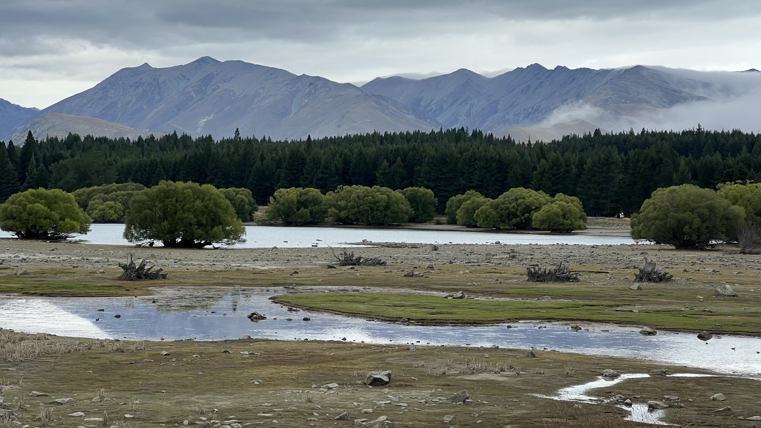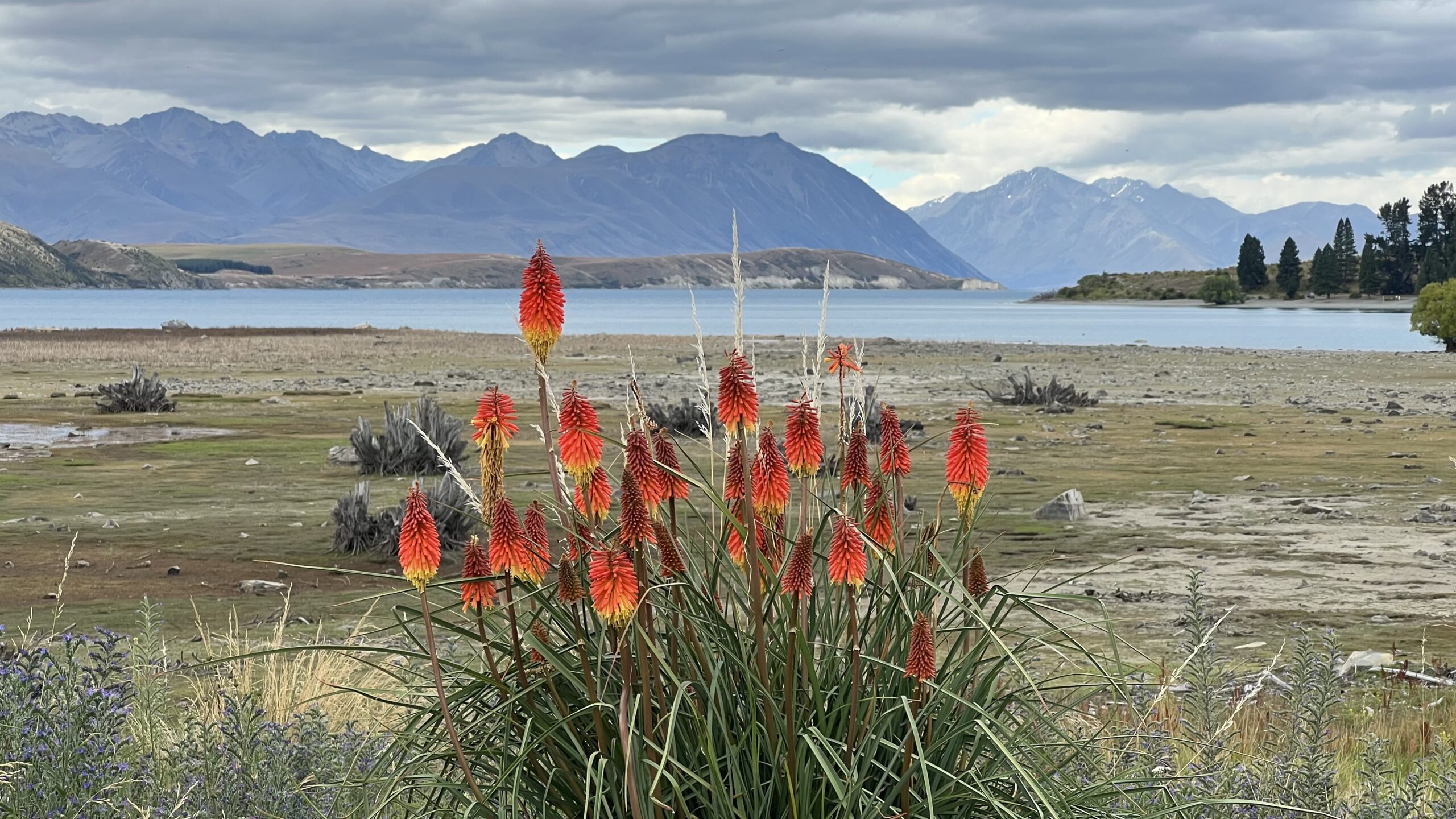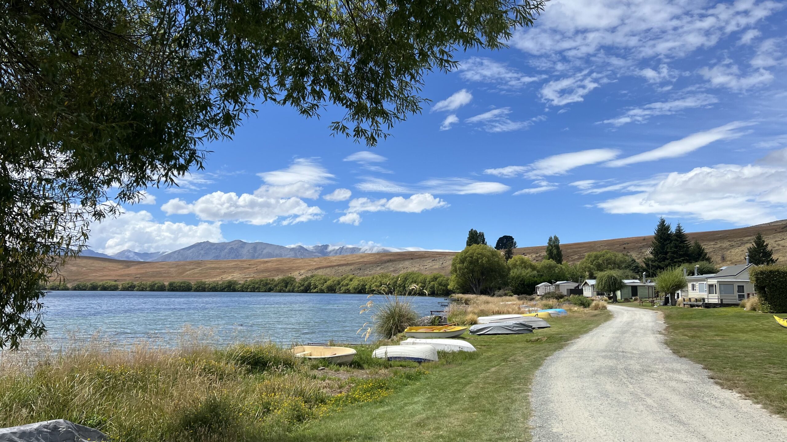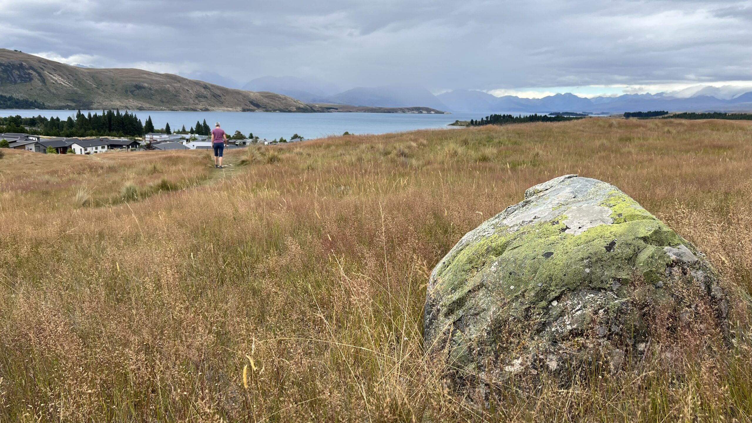 Das Wetter verschlechtert sich allmählich, der Himmel zieht sich zu. Bevor es anfängt zu regnen, machen wir am Spätnachmittag noch einen Spaziergang in der Umgebung unseres Häuschens. Erst vorbei am Seeufer des Lake Tekapo, dann auf einen Hügel oberhalb des Ortes.