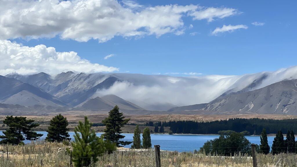 Für die Nutzung der Zufahrt zum Gipfel wird eine kleine Gebühr von 4 NZ$ fällig (Bargeld wird nicht akzeptiert). Unser kleiner Hybrid meistert den steilen Aufstieg mit Bravour. Oben gibt es die Forschungseinrichtungen sowie Unterkünfte für die Wissenschaftler. Das kleine „Astro-Cafè“ bietet einen wirklich atemberaubendem Rundblick über das Mackenziebecken, eine steppenartige Hochebene hinter der Bergkette der Südalpen. Wir sind sehr froh, dass wir spontan zuerst hierhin gefahren sind! Zur Belohnung gibt es eine Pie, zwei Kaffee und ein Stück Kuchen für uns beide, natürlich mit Fensterplatz.