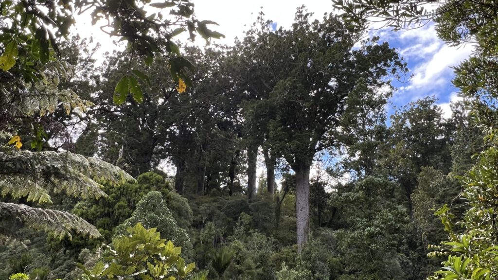 Dann sehen wir von einer kleinen Holzplattform aus die ersten Exemplare: einzelne hohe Baumkronen ragen weit aus dem restlichen Wald heraus. Kauri gehören zu den Araukarien und sind die größten (nicht die längsten) Bäume Neuseelands, gemessen am Volumen. Ursprünglich waren sie auf großen Teilen der Nord- und Südinsel verbreitet. Ihr gerade wachsendes, sehr stabiles und dennoch gut zu verarbeitendes Holz machte sie zum idealen Material für den Schiffbau. Außerdem nutzten die europäischen Siedler es für den Bau von Häusern, Zäunen, Eisenbahnschwellen und vielem mehr. Inzwischen ist die Art streng geschützt und es gibt nur noch einige wenige Gebiete im Norden der Nordinsel, in denen natürliche Vorkommen bestehen.