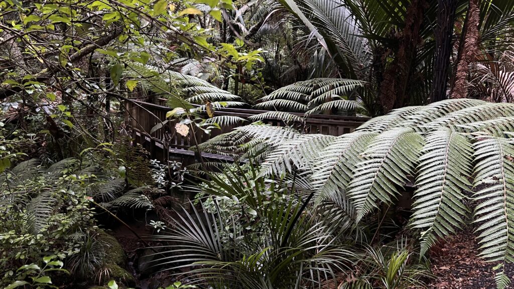 Hier muss man seine Schuhe möglichst sorgfältig reinigen, dann wird Desinfektionsmittel auf die Sohlen gespritzt. Der Hintergrund ist, dass die Kauris stark bedroht sind durch einen tödlichen Pilz, der ihre Wurzeln befällt („Kauri dieback“).
