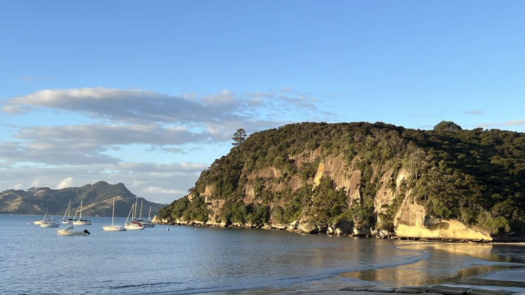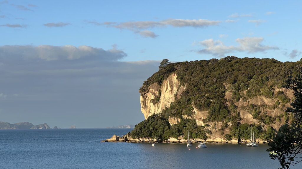 Nachdem am Nachmittag einige kräftige Regenschauer heruntergekommen sind, kommt gegen Abend wieder die Sonne heraus. Wir nehmen die kleine Fußgängerfähre und schauen uns ein bisschen in und um Whitianga um. Das Licht auf den Sandsteinfelsen des Shakespeare Cliffs gefällt uns ganz besonders…
