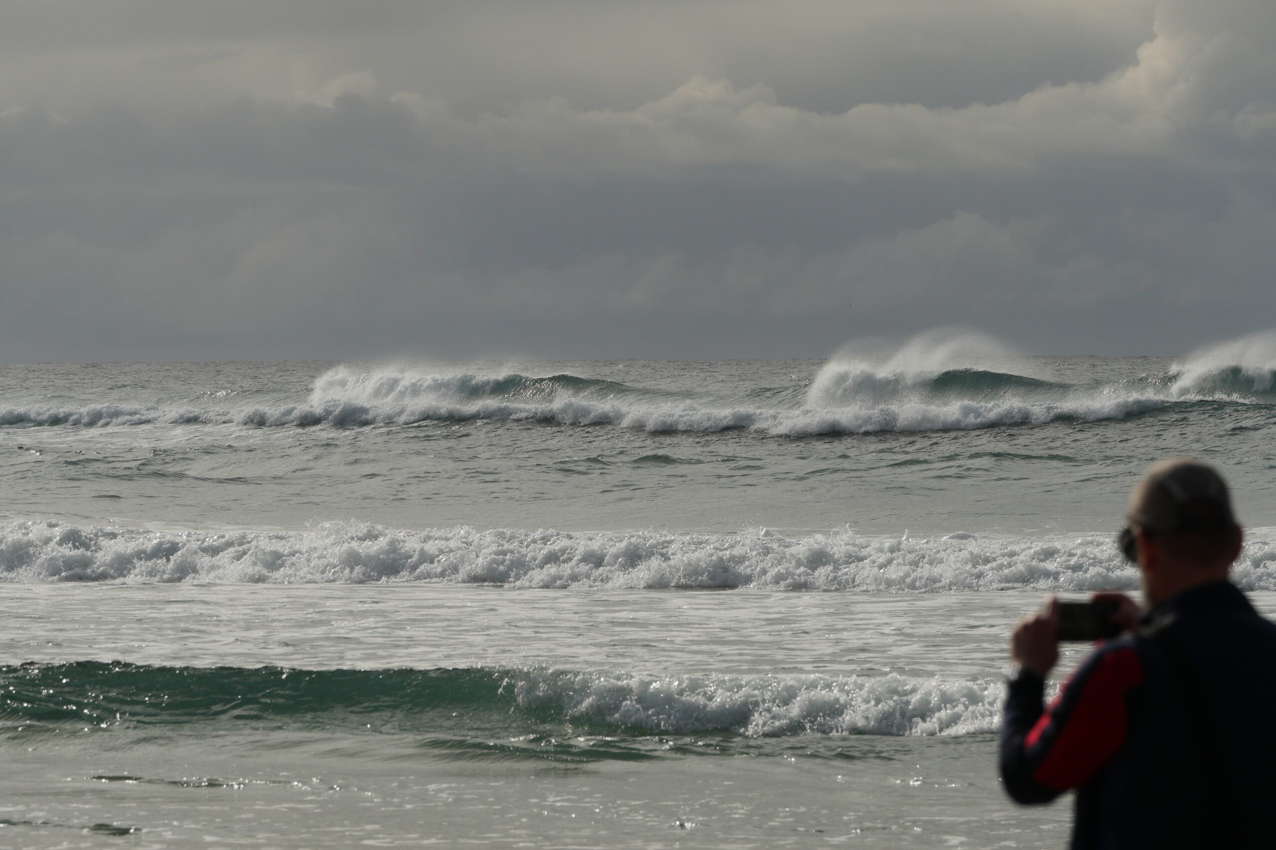 Morgens scheint die Sonne schon ein kleines bisschen zwischen den Wolken hindurch, scheint ein recht schöner Tag zu werden. Der schier endlose Sandflächeund die kräftige Brandung laden ein zu einem ausgedehnten Strandspaziergang. Viele Hundebesitzer lassen ihren Vierbeinern freien Lauf, und die toben sehr ausgelassen herum. Es macht Spaß, ihnen dabei zuzuschauen.