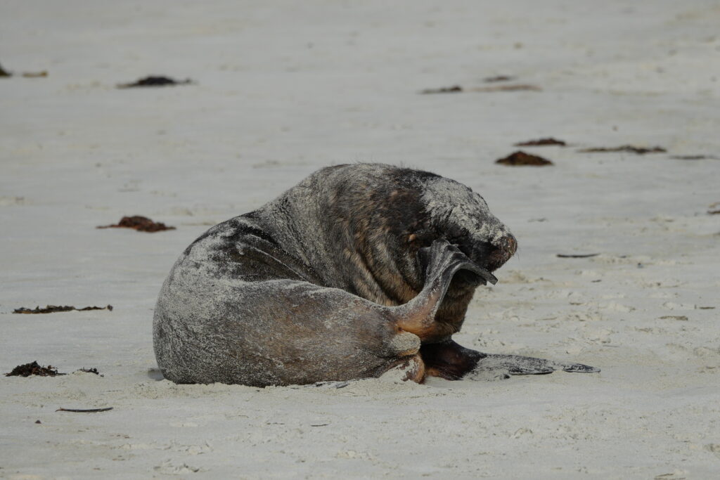 Nach einer Weile sehen wir einen stattlichen Seebärbullen auf‘s Trockene robben. Er räkelt sich ausgiebig und vollzieht ein intensives Kratzritual…