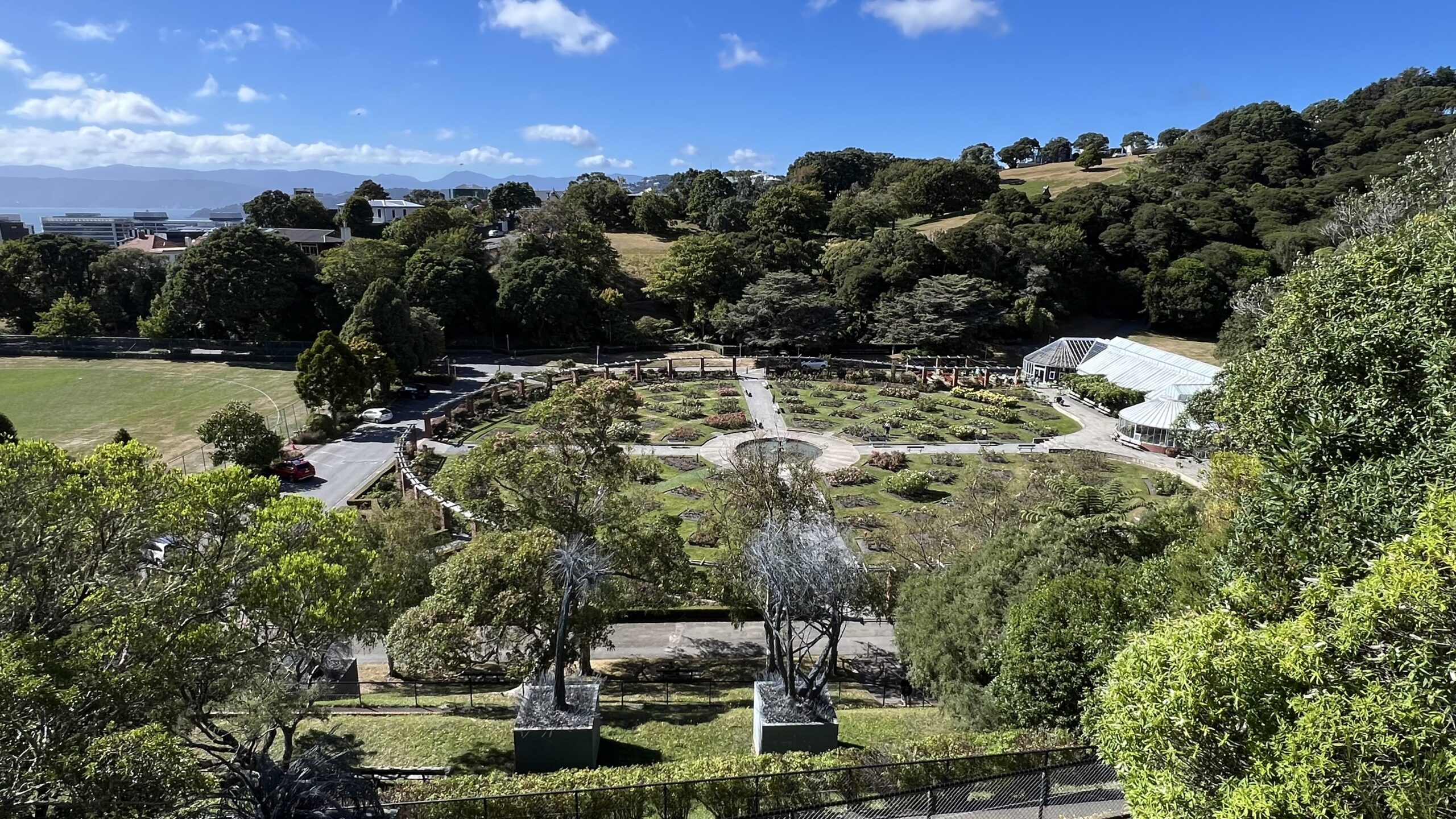 Zuerst gehen wir zum Botanischen Garten. Nachdem wir bereits einige neuseeländische Gärten gesehen haben, sind wir zunächst ein bisschen enttäuscht, denn wir finden nur wenige Erklärungen zu besonderen Pflanzen. Vieles wirkt relativ ungepflegt und verwahrlost, so z.B. der Kräutergarten. Der 1960 angelegte Lady Norwood Rose Garden ist dagegen recht hübsch und hat einige sehr schöne Exemplare mit herrlich duftenden Blüten. Gleich nebenan betreten wir ein gläsernes Treibhaus mit einer Begonienausstellung. Im benachbarten Teil sind Orchideen und andere Exoten ausgestellt, alles in prächtigen Farben und sehr gepflegt – wie schön!
