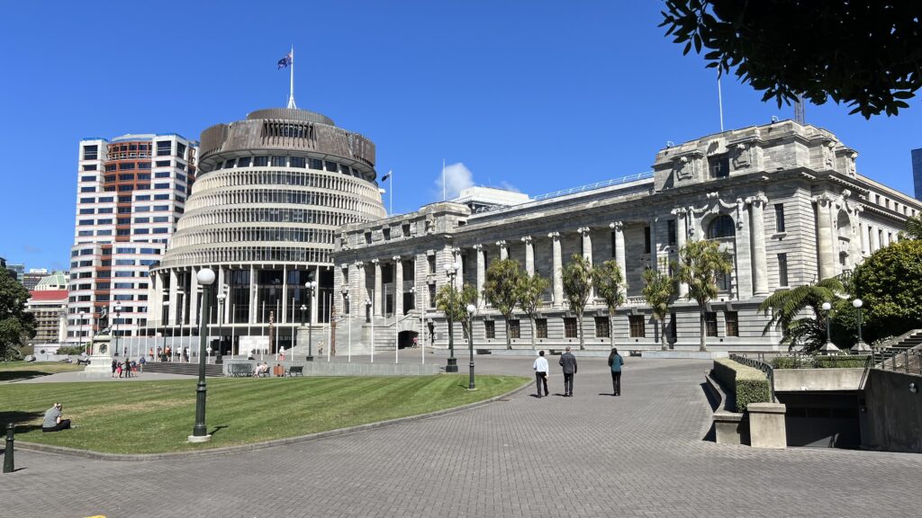 Unser Spaziergang führt uns am 1922 errichteten Parlamentsgebäude vorbei, das man in den 1980er Jahren erdbebensicher nachgerüstet und auf 417 Schwingungsdämpfer aus Gummi gesetzt hat. Nebenan befindet sich der „Beehive“ (= Bienenstock) genannte Sitz des Primierministers und der Kabinettsmitglieder, gebaut 1969-1979.