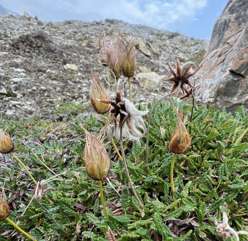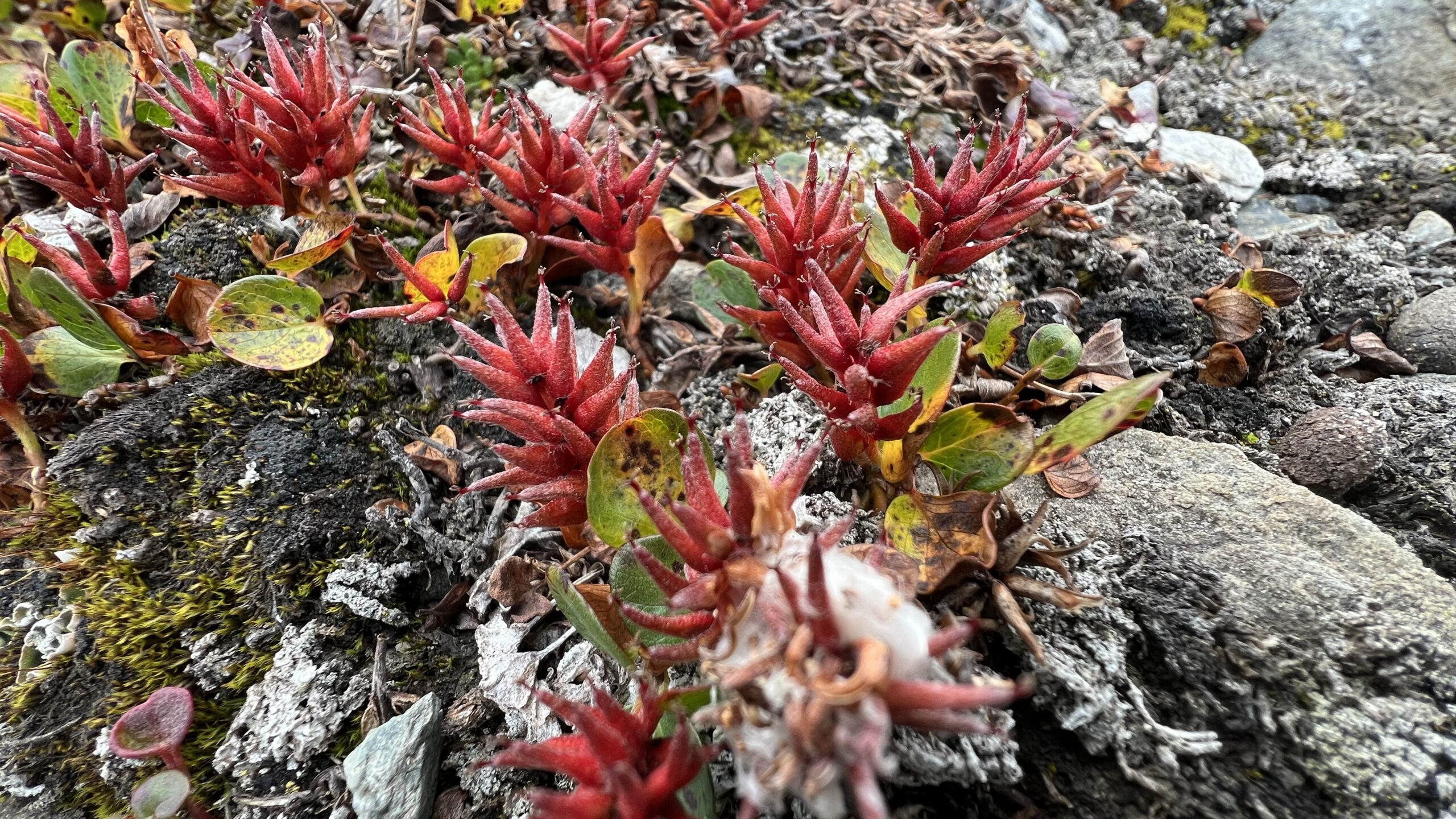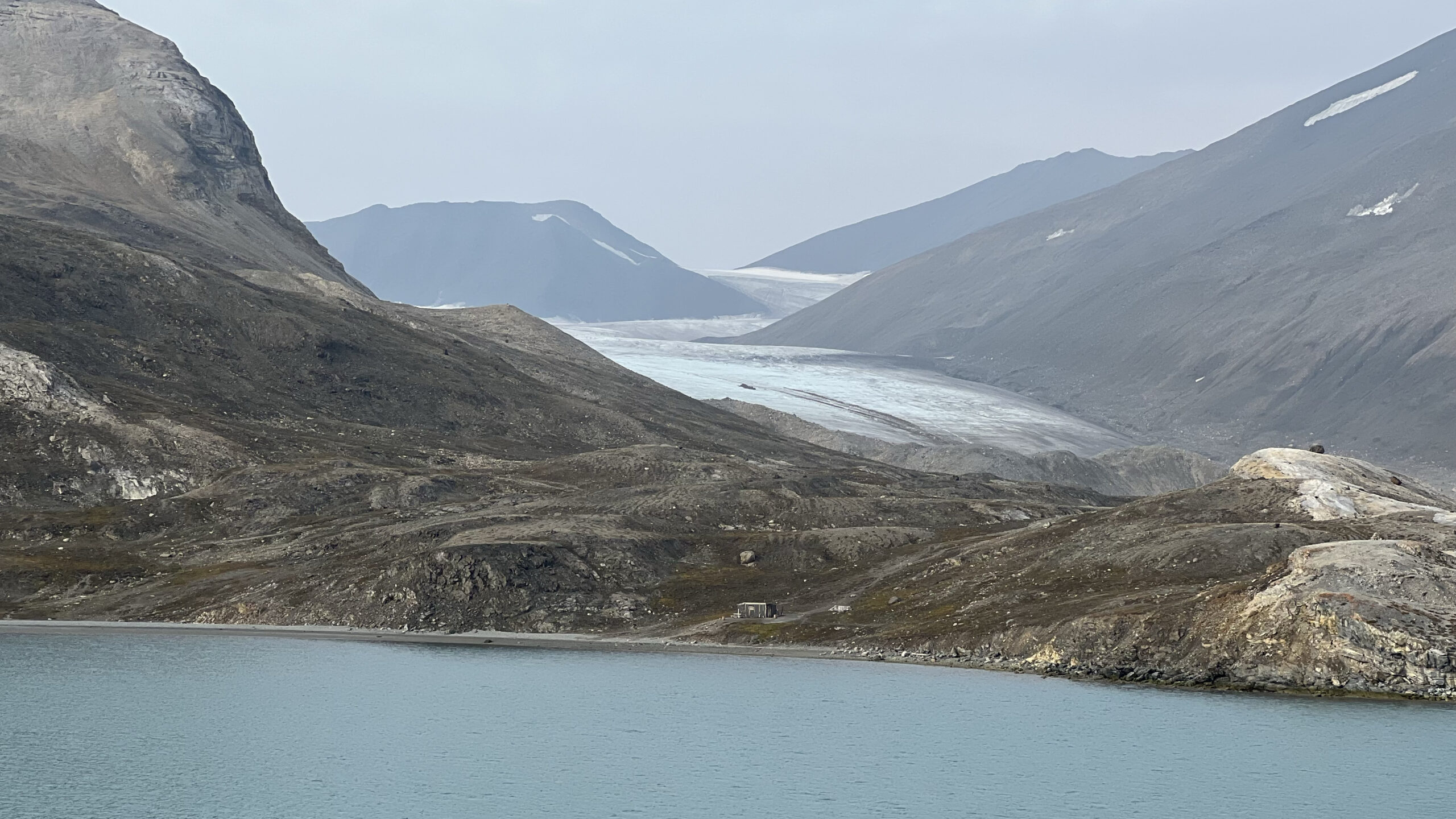 Ziemlich durchgefroren machen wir anschließend einen Landgang bei der Hütte Texas Bar. Sie befindet sich am Rand einer großen Gletschermoräne. Das Eis ist bereits stark zurückgewichen und hat einen großen Schwemmfächer hinterlassen. Bei einem Spaziergang laufen wir uns wieder warm, nebenbei entdecken wir die arktische Vegetation, manche Pflanzen blühen noch, manche zeigen schon herbstliche Färbung. Eine Stelle im Gelände wurde von den Guides vorsorglich abgesperrt, da hier das noch nicht flugfähige Küken einer Skua-Raubmöwe sitzt. Da diese Vögel ihre Brut sehr aggressiv verteidigen, hält man besser Abstand.